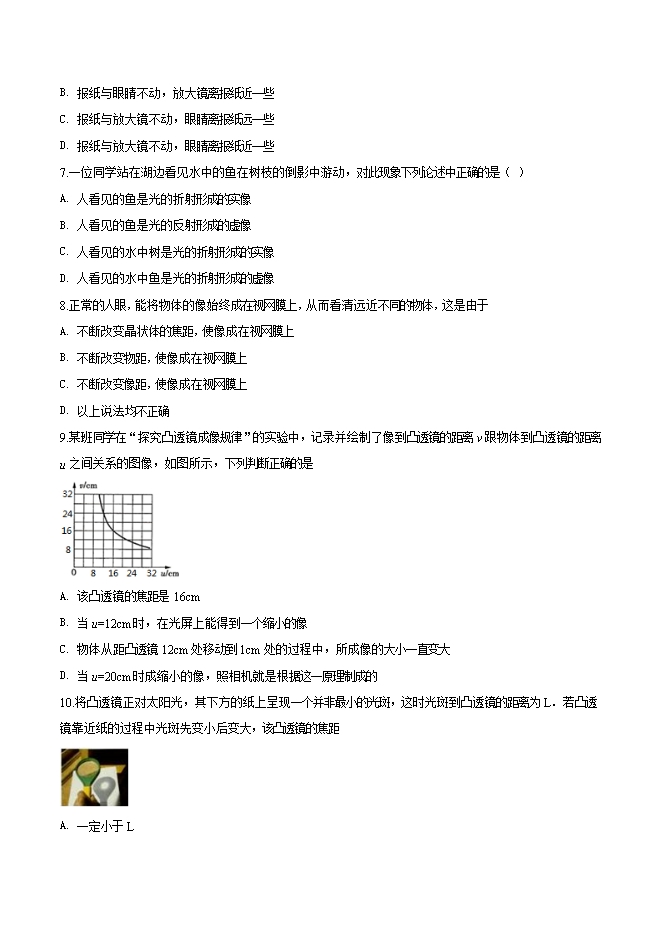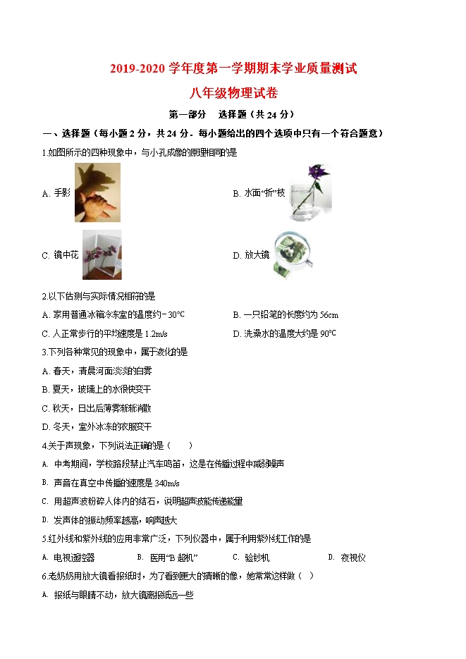 【内容简介】一、选择题(每小题2分,共24分.每小题给出的四个选项中只有一个符合题意)1.如图所示的四种现象中,与小孔成像的原理相同的是A. 手影 B. 水面“折”枝C. 镜中花 D. 放大镜2.以下估测与实际情况相符的是A. 家用普通冰箱冷冻室温度约-30℃ B. 一只铅笔的长度约为56cmC. 人正常步行的平均速度是1.2m/s D. 洗澡水的温度大约是90℃3.下列各种常见的现象中,属于液化的是A. 春天,清晨河面淡淡的白雾B. 夏天,玻璃上的水很快变干C. 秋天,日出后薄雾渐渐消散D. 冬天,室外冰冻的衣服变干4.关于声现象,下列说法正确的是( )A. 中考期间,学校路段禁止汽车鸣笛,这是在传播过程中减弱噪声B. 声音在真空中传播的速度是340m/sC. 用超声波粉碎人体内的结石,说明超声波能传递能量D. 发声体的振动频率越高,响声越大5.红外线和紫外线的应用非常广泛,下列仪器中,属于利用紫外线工作的是A. 电视遥控器 B. 医用“B超机” C. 验钞机 D. 夜视仪6.老奶奶用放大镜看报纸时,为了看到更大清晰的像,她常常这样做( )A. 报纸与眼睛不动,放大镜离报纸远一些B. 报纸与眼睛不动,放大镜离报纸近一些C. 报纸与放大镜不动,眼睛离报纸远一些D. 报纸与放大镜不动,眼睛离报纸近一些7.一位同学站在湖边看见水中的鱼在树枝的倒影中游动,对此现象下列论述中正确的是()A. 人看见的鱼是光的折射形成的实像B. 人看见的鱼是光的反射形成的虚像C. 人看见的水中树是光的折射形成的实像D. 人看见的水中鱼是光的折射形成的虚像