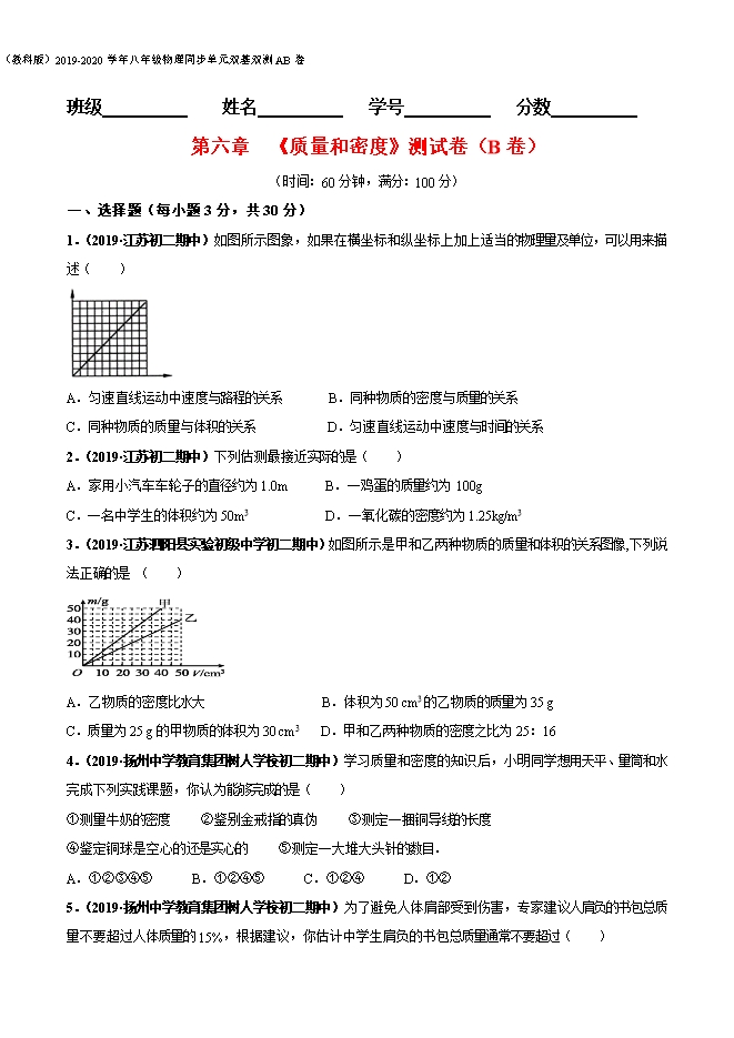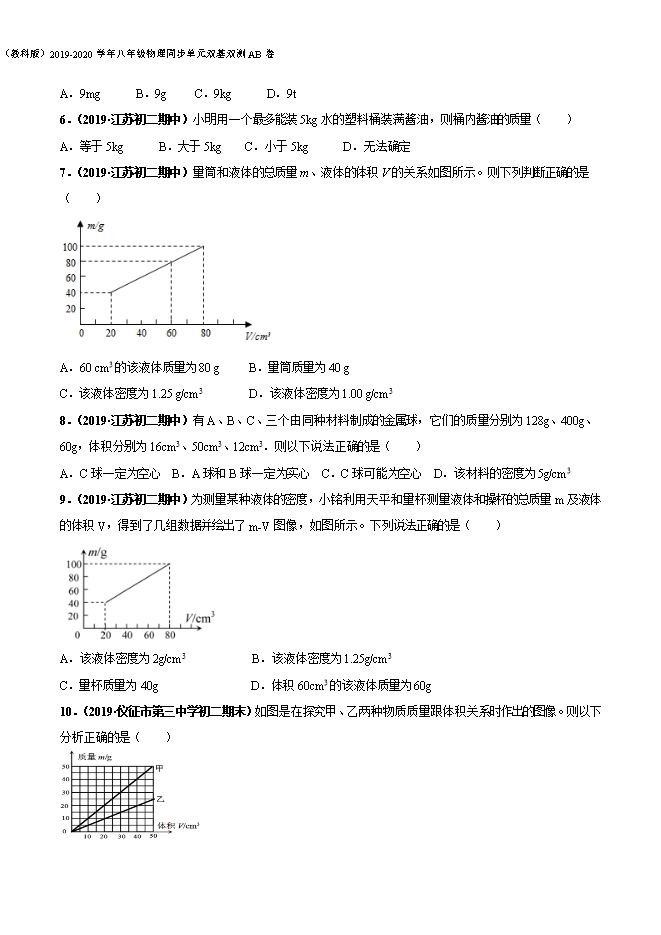 【内容简介】一、选择题(每小题3分,共30分)1.(2019·江苏初二期中)如图所示图象,如果在横坐标和纵坐标上加上适当的物理量及单位,可以用来描述( )A.匀速直线运动中速度与路程的关系 B.同种物质的密度与质量的关系C.同种物质的质量与体积的关系 D.匀速直线运动中速度与时间的关系【答案】C【解析】由图象可知,横坐标表示的物理量和纵坐标表示的物理量是成正比的关系;A.匀速直线运动中速度是一个定值,与路程没有关系,不能用该图象描述;B.密度是物质本身的一种特有的属性,与物体的质量无关,不能用该图象描述;C.物质的密度是一定的,由ρ=可知,同种物质的质量与体积成正比,可以用该图象描述;D.匀速直线运动的物体,速度是一定值,速度与时间无关,不能用该图象描述。2.(2019·江苏初二期中)下列估测最接近实际的是( )A.家用小汽车车轮子的直径约为1.0m B.一鸡蛋的质量约为 100gC.一名中学生的体积约为50m3 D.一氧化碳的密度约为1.25kg/m3【答案】D【解析】A.家用小汽车的轮胎直径一般在60cm----70cm之间,合0.6m----0.7m,故A不符合实际;B.10个鸡蛋大约是1斤(500g),一个鸡蛋质量大约是50g左右,故B不符合实际;C.一名中学生的质量大约50kg,人体的密度大约等于水的密度,根据V===0.05m3;故C不符合题意;D.一氧化碳的密度比空气的密度稍小一点,空气的密度是1.29kg/m3,所以一氧化碳的密度约为1.25kg/m3,故D符合题意。3.(2019·江苏泗阳县实验初级中学初二期中)如图所示是甲和乙两种物质的质量和体积的关系图像,下列说法正确的是( )A.乙物质的密度比水大 B.体积为50 cm3的乙物质的质量为35 gC.质量为25 g的甲物质的体积为30 cm3 D.甲和乙两种物质的密度之比为 25:16【答案】D【解析】图象的横轴表示体积,纵轴表示质量。A.由图象可知,乙物质的密度,故A错误;B.由图象可知,体积为50cm3的乙物质的质量为40g,故B错误;C.由图象可知,质量为25g的甲物质的体积为20cm3,故C错误;D.由图象可知,甲物质的密度,所以甲和乙两种物质的密度之比为,故D正确。