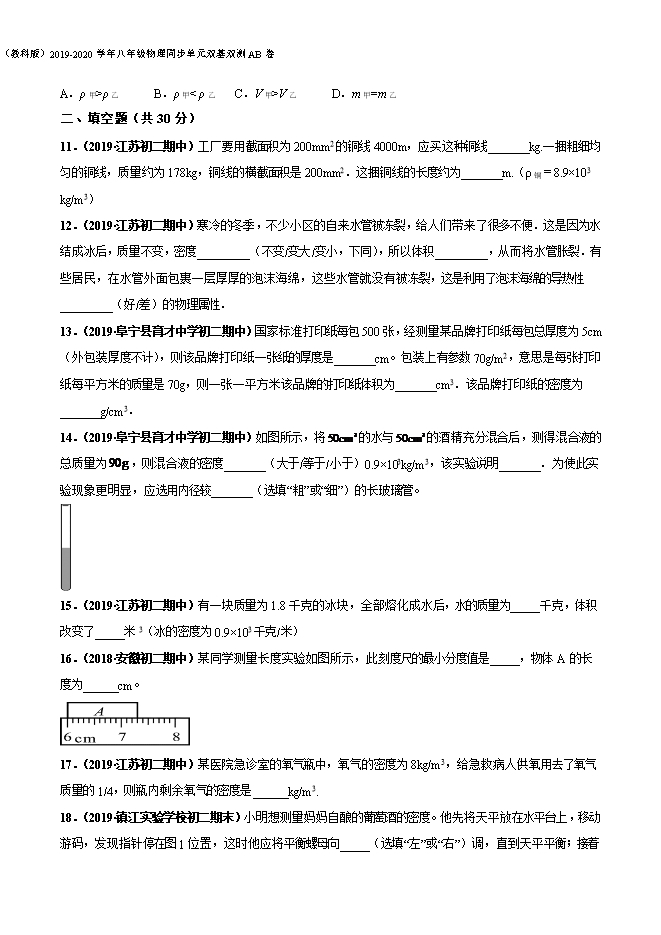 (教科版)2019-2020学年八年级物理同步单元双基双测AB卷:第06章 质量和密度(B卷提升篇)