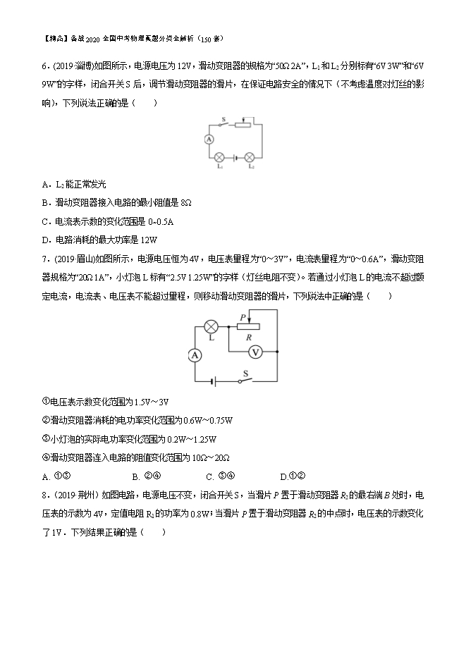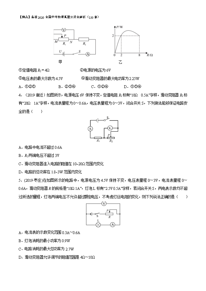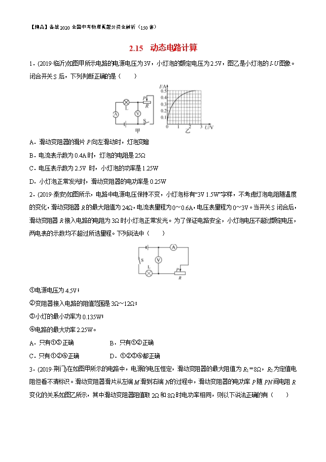 【内容简介】1.(2019·临沂)如图甲所示电路的电源电压为3V,小灯泡的额定电压为2.5V,图乙是小灯泡的I-U图象。闭合开关S后,下列判断正确的是( )A.滑动变阻器的滑片P向左滑动时,灯泡变暗B.电流表示数为0.4A时,灯泡的电阻是25ΩC.电压表示数为2.5V 时,小灯泡的功率是1.25WD.小灯泡正常发光时,滑动变阻器的电功率是0.25W【答案】D【解析】A、由图可知,闭合开关S后,灯泡与变阻器串联,电压表测变阻器两端的电压,电流表测电路中的电流,滑片P向左滑动时,电路中的电阻变小,由欧姆定律可知,电路中的电流变大,即通过灯泡电流变大,因此灯泡的实际功率增大,则灯泡变亮,故A错误;B、由灯泡的I-U图象可知,当电流为0.4A时,灯泡两端的电压为1V,由欧姆定律可得,灯泡的电阻:RL===2.5Ω,故B错误; C、电压表示数为2.5V时,由串联电路电压的规律,灯泡两端的电压为:UL′=U-U滑′=3V-2.5V=0.5V,由图象可知,灯泡两端的电压为0.5V时电流为0.3A,则小灯泡的功率:PL′=UL′I′=0.5V×0.3A=0.15W,故C错误;D、小灯泡的电压等于额定电压2.5V时,灯正常发光,由图象可知灯的额定电流为0.5A,根据串联电路电压的规律,变阻器两端的电压为:U滑=U-UL额=3V-2.5V=0.5V,此时滑动变阻器的功率:P滑=U滑I滑=0.5V×0.5A=0.25W,故D正确。2.(2019·泰安)如图所示,电路中电源电压保持不变,小灯泡标有“3V 1.5W”字样,不考虑灯泡电阻随温度的变化,滑动变阻器R的最大阻值为24Ω,电流表量程为0~0.6A,电压表量程为0~3V。当开关S闭合后,滑动变阻器R接入电路的电阻为3Ω时小灯泡正常发光。为了保证电路安全,小灯泡电压不超过额定电压,两电表的示数均不超过所选量程。下列说法中( )①电源电压为4.5V;②变阻器接入电路的阻值范围是3Ω~12Ω;③小灯的最小功率为0.135W;④电路的最大功率2.25W。A.只有①③正确 B.只有①②正确 C.只有①②④正确 D.①②③④都正确【答案】C【解析】由图知,灯泡和滑动变阻器串联,电压表测变阻器两端的电压,电流表测电路中的电流;(1)由P=可得灯泡的电阻:RL== =6Ω,由P=UI可得,灯泡正常发光时通过的电流:I额== =0.5A,由题知,当开关S闭合后,滑动变阻器R接入电路的电阻为3Ω时,小灯泡正常发光,由欧姆定律和电阻的串联可得电源电压:U=I额R串=I额×(R+RL)=0.5A×(3Ω+6Ω)=4.5V,故①正确;(2)因串联电路中电流处处相等,且电流表量程为0~0.6A,灯泡的额定电流为0.5A,所以为了保证电路中各元件安全工作,电路中的最大电流I最大=I额=0.5A,电路中的总电阻:R最小= = =9Ω,滑动变阻器连入电路中的最小阻值:R最小=R总-RL=9Ω-6Ω=3Ω,由于电压表量程为0~3V,当电压表的示数最大为U滑′=3V时,滑动变阻器接入电路的电阻最大,此时灯泡两端的电压为:UL′=U-U滑′=4.5V-3V=1.5V,此时电路的电流为:I最小= = =0.25A,滑动变阻器接入电路的最大阻值:R最大== =12Ω,所以为保护电路,变阻器接入电路的阻值范围是3Ω~12Ω,故②正确;(3)小灯泡的最小功率:PL最小=I最小2RL=(0.25A)2×6Ω=0.375W,故③错误;