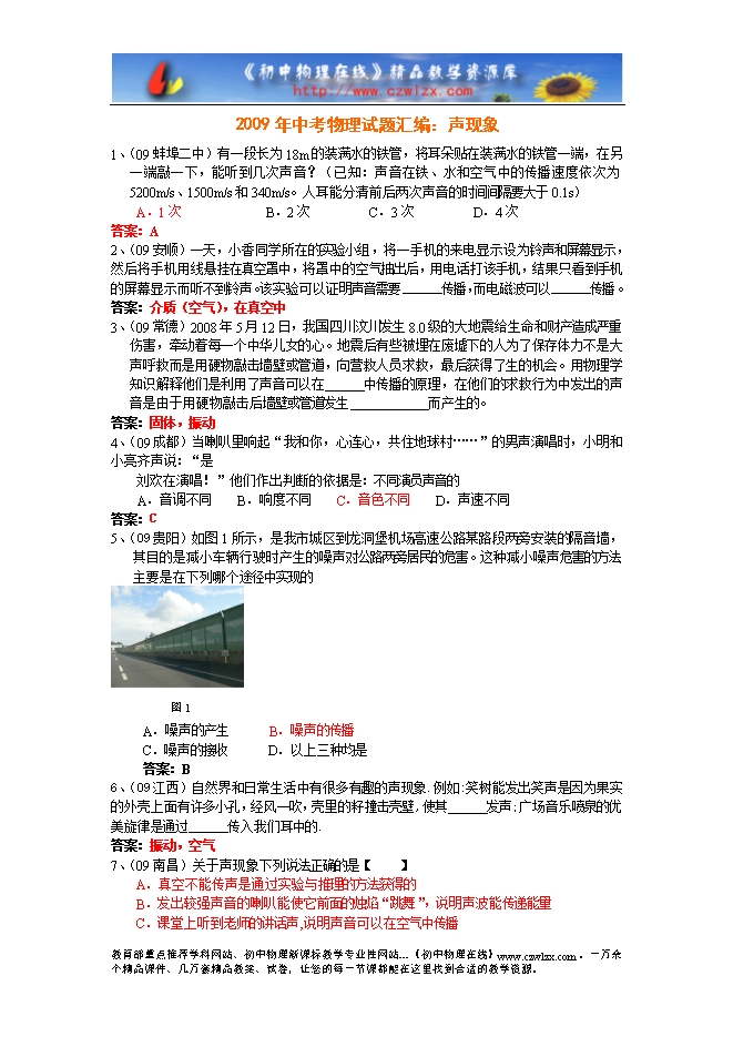 5、(09贵阳)如图1所示,是我市城区到龙洞堡机场高速公路某路段两旁安装的隔音墙,其目的是减小车辆行驶时产生的噪声对公路两旁居民的危害。这种减小噪声危害的方法主要是在下列哪个途径中实现的