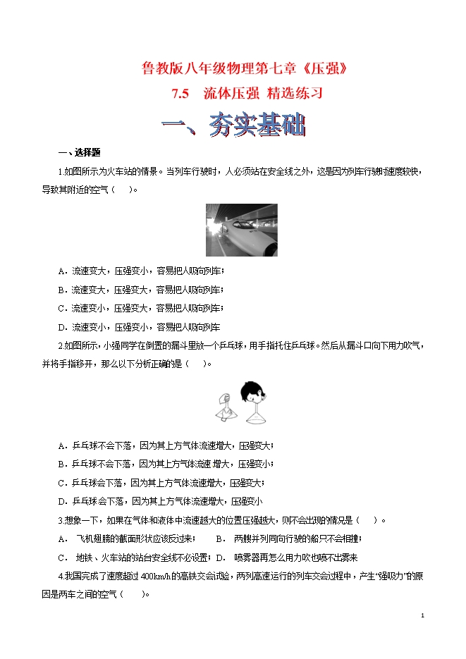 【内容简介】【精品】2019-2020学年鲁教版八年级下册物理同步课堂:7.5流体压强(课件 精选练习)