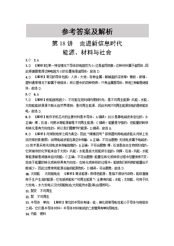 2020年福建省中考物理一轮基础考点一遍过(课件+精练):第18讲 走进信息时代 能源、材料与社会 (共2份打包)