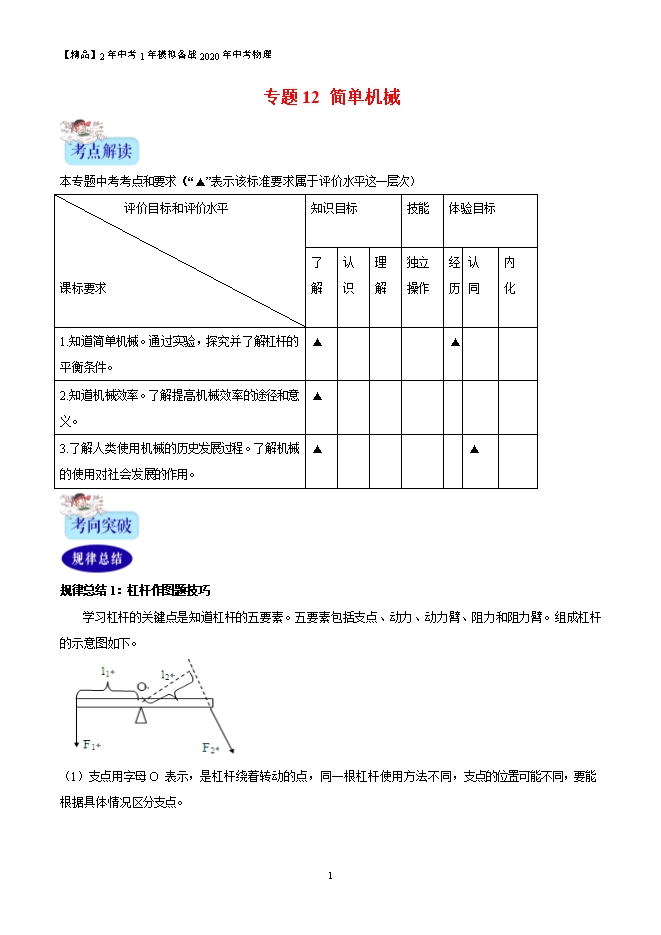 【精品】2年中考1年模拟备战2020年中考物理:专题12 简单机械(原卷版和解析版)