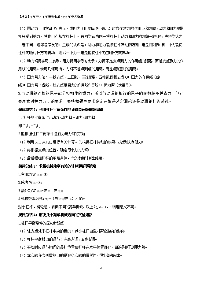 【内容简介】(1)支点用字母O 表示,是杠杆绕着转动的点,同一根杠杆使用方法不同,支点的位置可能不同,要能根据具体情况区分支点。(2)画动力(用字母 F1表示)或阻力(用字母 F2表示)时应注意力的作用点和方向。动力和阻力都是杠杆受到的力,其作用点都在杠杆上。有同学认为同一根杠杆上动力和阻力的方向一定相同,有同学认为一定不同,这都是错误的。正确的认识是:动力和阻力能使杠杆转动的方向一定是相反的。即一个力能使杠杆向顺时针方向转动,则另一个力一定是能使杠杆向逆时针方向转动。(3)动力臂用字母l1表示,阻力臂用字母l2表示。力臂不是支点到力的作用点的距离,而是支点到力的作用线的距离。借用几何用语,力臂不是点到点的距离,而是点到直线的距离。(4)画力臂方法:一找支点、二画线、三连距离、四标签.即找支点O;画力的作用线(虚线);画力臂(虚线,过支点垂直力的作用线作垂线);标力臂(大括号)。3.与动滑轮连接的绳子能分担物体的重力,所以与动滑轮相连的绳子的股数越多越省力,但还要注意对拉力方向的要求。要根据题中要求确定开始是从定滑轮还是动滑轮挂钩系线。规律总结2:利用杠杆平衡条件的计算类问题解题思路1.杠杆的平衡条件:动力×动力臂=阻力×阻力臂即 F1L1=F2L22.能根据杠杆平衡条件进行力与力臂的求解(1)利用F1 L1=F2L2进行有关计算。先根据杠杆转动的效果,找出动力和阻力;(2)再根据支点的位置,确定每个力的力臂;(3)最后根据杠杆的平衡条件,代入数据计算出结果。规律总结3:求解机械效率有关的计算题解题策略1.有用功W有用=Gh 2.总功W总= Fs3.额外功W额外=W总—W有用4.机械效率公式:η=(W有用/W总)×100% 对于杠杆、滑轮组、斜面不同的简单机械,以上公式中s、h物理意义不同。