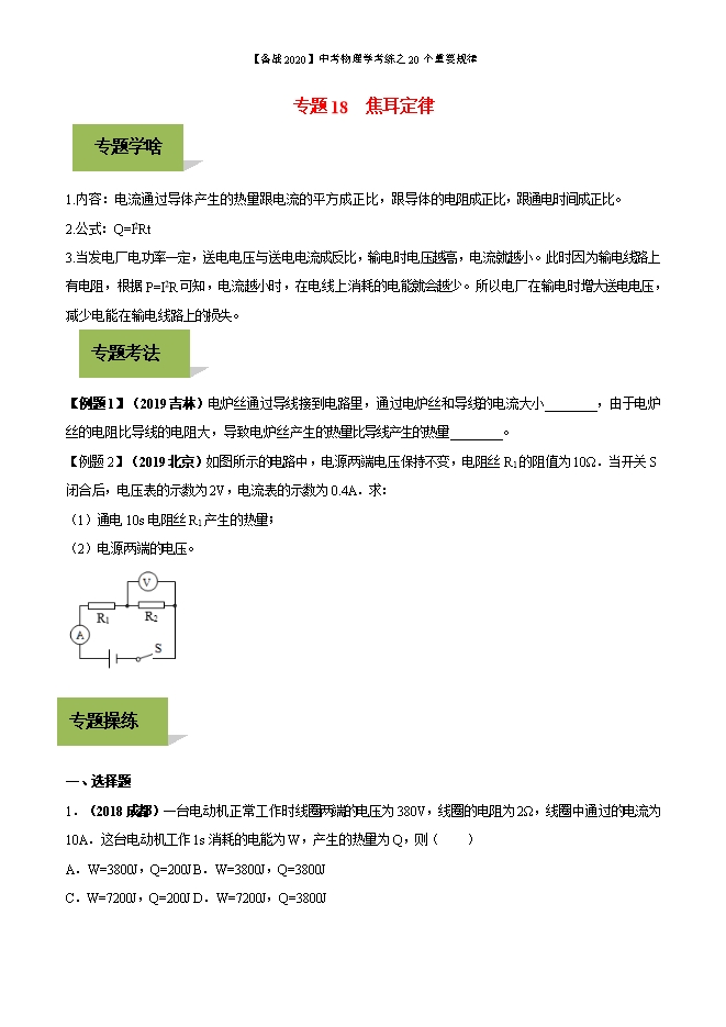【内容简介】备战2020年中考物理学考练之20个重要规律:专题18 焦耳定律