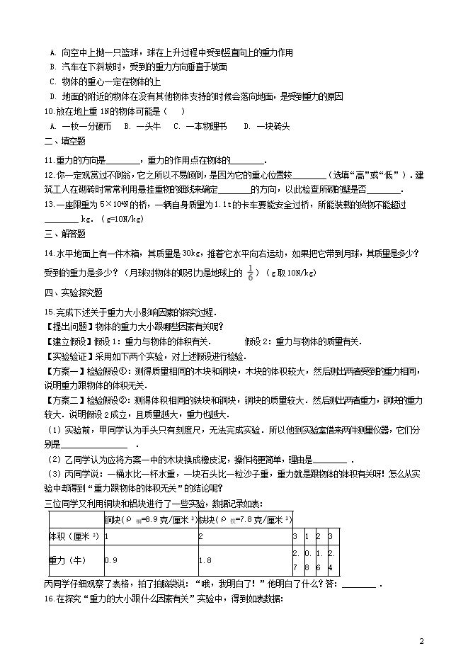 【内容简介】二、填空题 11.重力的方向是________,重力的作用点在物体的________. 12.你一定观赏过不倒翁,它之所以不易倾倒,是因为它的重心位置较________(选填“高”或“低”).建筑工人在砌砖时常常利用悬挂重物的细线来确定________的方向,以此检查所砌的壁是否________. 13.一座限重为5×104N的桥,一辆自身质量为1.1t的卡车要能安全过桥,所能装载的货物不能超过________ kg.(g=10N/kg)三、解答题 14.水平地面上有一件木箱,其质量是30kg,推着它水平向右运动,如果把它带到月球,其质量是多少?受到的重力是多少?(月球对物体的吸引力是地球上的 )(g取10N/kg) 四、实验探究题 15.完成下述关于重力大小影响因素的探究过程.【提出问题】物体的重力大小跟哪些因素有关呢?【建立假设】假设1:重力与物体的体积有关. 假设2:重力与物体的质量有关.【实验验证】采用如下两个实验,对上述假设进行检验.【方案一】检验假设①:测得质量相同的木块和铜块,木块的体积较大,然后测出两者受到的重力相同,说明重力跟物体的体积无关.【方案二】检验假设②:测得体积相同的铁块和铜块,铜块的质量较大.然后测出两者重力,铜块的重力较大.说明假设2成立,且质量越大,重力也越大.(1)实验前,甲同学认为手头只有刻度尺,无法完成实验.所以他到实验室借来两件测量仪器,它们分别是________________ .(2)乙同学认为应将方案一中的木块换成橡皮泥,操作将更简单,理由是________ .(3)丙同学说:一桶水比一杯水重,一块石头比一粒沙子重,重力就是跟物体的体积有关呀!怎么从实验中却得到“重力跟物体的体积无关”的结论呢?