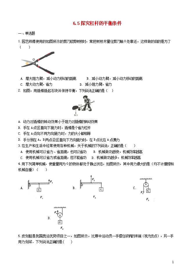2020春沪粤版八年级物理下册同步练习:《6.5探究杠杆的平衡条件》含解析