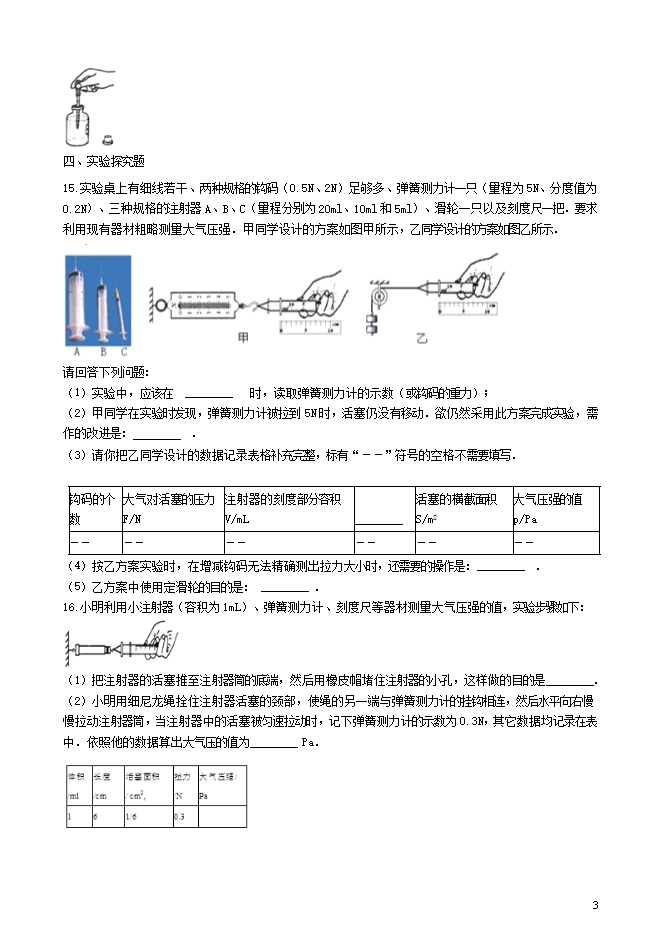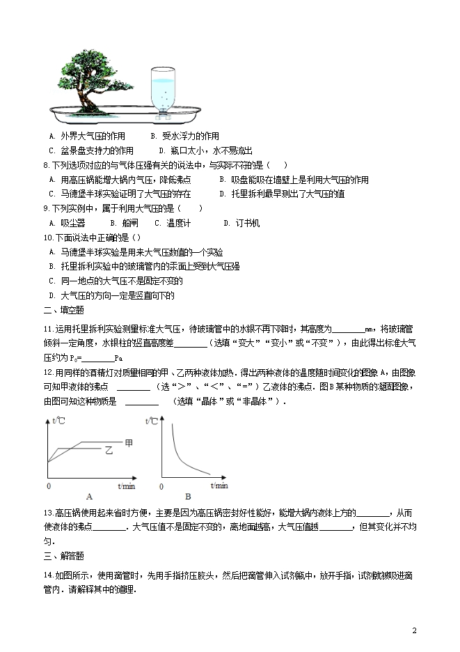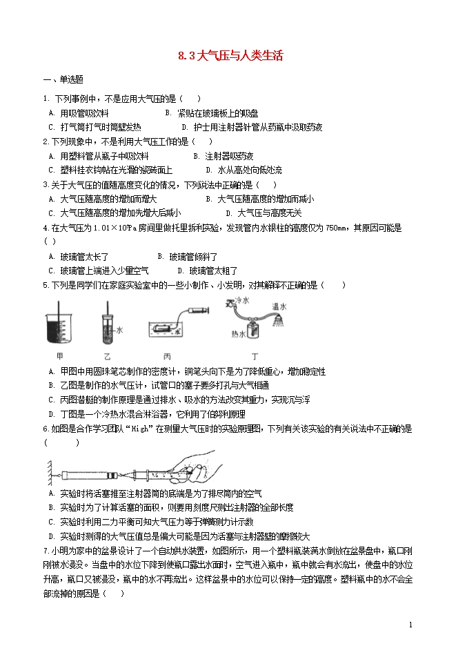 【内容简介】一、单选题 1. 下列事例中,不是应用大气压的是( ) A. 用吸管吸饮料 B. 紧贴在玻璃板上的吸盘 C. 打气筒打气时筒壁发热 D. 护士用注射器针管从药瓶中汲取药液2.下列现象中,不是利用大气压工作的是( ) A. 用塑料管从瓶子中吸饮料 B. 注射器吸药液 C. 塑料挂衣钩帖在光滑的瓷砖面上 D. 水从高处向低处流3.关于大气压的值随高度变化的情况,下列说法中正确的是( )A. 大气压随高度的增加而增大 B. 大气压随高度的增加而减小 C. 大气压随高度的增加先增大后减小 D. 大气压与高度无关4.在大气压为1.01×105Pa房间里做托里拆利实验,发现管内水银柱的高度仅为750mm,其原因可能是 ( ) A. 玻璃管太长了 B. 玻璃管倾斜了 C. 玻璃管上端进入少量空气 D. 玻璃管太粗了5.下列是同学们在家庭实验室中的一些小制作、小发明,对其解释不正确的是( )