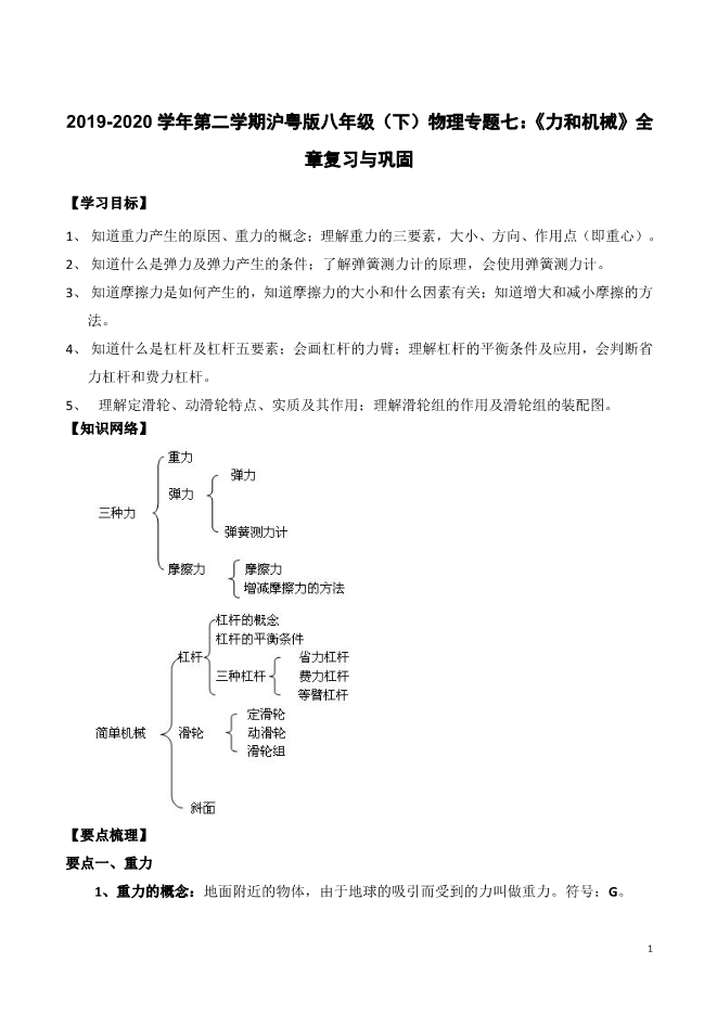 【内容简介】2019-2020学年第二学期沪粤版八年级物理(下)专题七:《力和机械》全章复习与巩固知识点总结及习题精练(PDF详解版)
