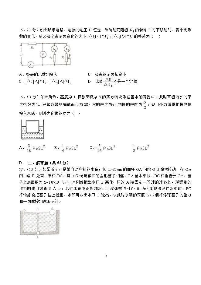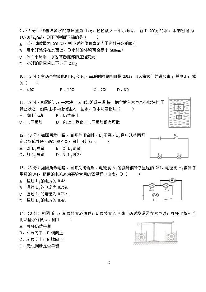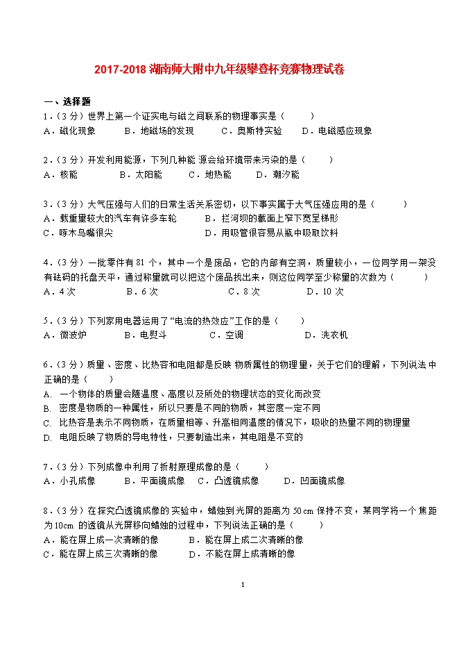 【内容简介】1.(3 分)世界上第一个证实电与磁之间联系的物理事实是( )A.磁化现象 B.地磁场的发现 C.奥斯特实验 D.电磁感应现象 2.(3 分)开发利用能源,下列几种能源会给环境带来污染的是( )A.核能 B.太阳能 C.地热能 D.潮汐能 3.(3 分)大气压强与人们的日常生活关系密切,以下事实属于大气压强应用的是( )A.载重量较大的汽车有许多车轮 B.拦河坝的截面上窄下宽呈梯形C.啄木鸟嘴很尖 D.用吸管很容易从瓶中吸取饮料 4.(3 分)一批零件有 81 个,其中一个是废品,它的内部有空洞,质量较小,一位同学用一架没有砝码的托盘天平,通过称量就可以把这个废品找出来,则这位同学至少称量的次数为( )A.4 次 B.6 次 C.8 次 D.10 次 5.(3 分)下列家用电器运用了“电流的热效应”工作的是( )A.微波炉 B.电熨斗 C.空调 D.洗衣机 6.(3 分)质量、密度、比热容和电阻都是反映物质属性的物理量,关于它们的理解,下列说法中正确的是( )A. 一个物体的质量会随温度、高度以及所处的物理状态的变化而改变B. 密度是物质的一种属性,所以只要是不同的物质,其密度一定不同C. 比热容是表示不同物质,在质量相等、升高相同温度的情况下,吸收的热量不同的物理量D. 电阻反映了物质的导电特性,只要制造出来,其电阻是不变的