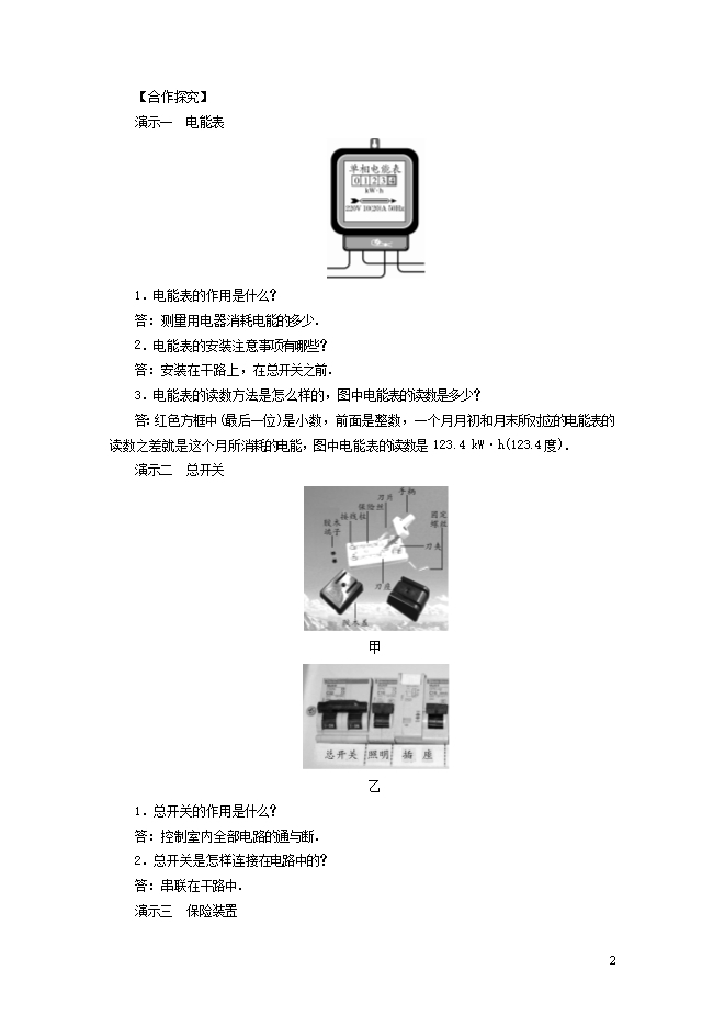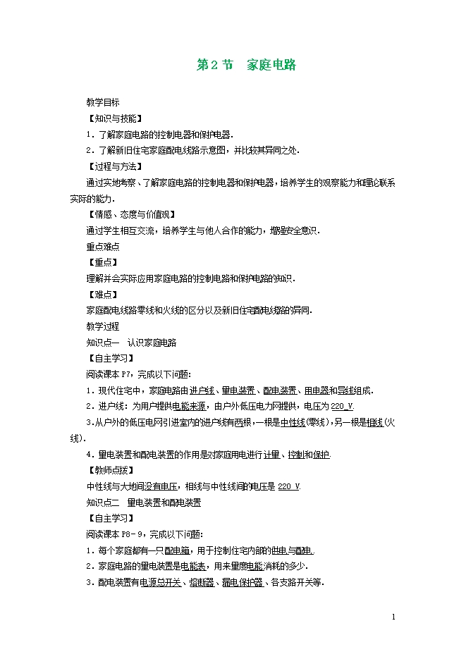 【内容简介】1.现代住宅中,家庭电路由进户线、量电装置、配电装置、用电器和导线组成.2.进户线:为用户提供电能来源,由户外低压电力网提供,电压为220_V.3.从户外的低压电网引进室内的进户线有两根,一根是中性线(零线),另一根是相线(火线).4.量电装置和配电装置的作用是对家庭用电进行计量、控制和保护.【教师点拨】中性线与大地间没有电压,相线与中性线间的电压是220_V.知识点二 量电装置和配电装置【自主学习】阅读课本P8-9,完成以下问题:1.每个家庭都有一只配电箱,用于控制住宅内部的供电与配电.2.家庭电路的量电装置是电能表,用来量度电能消耗的多少.3.配电装置有电源总开关、熔断器、漏电保护器、各支路开关等.