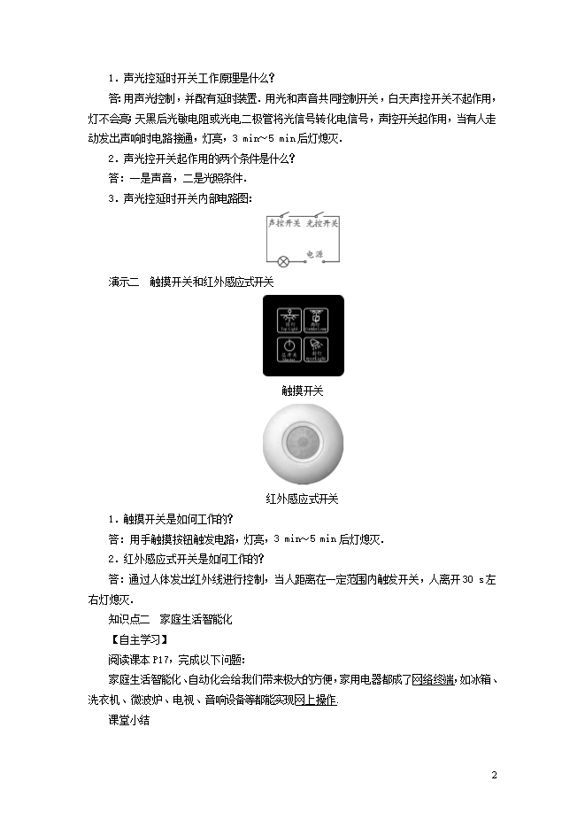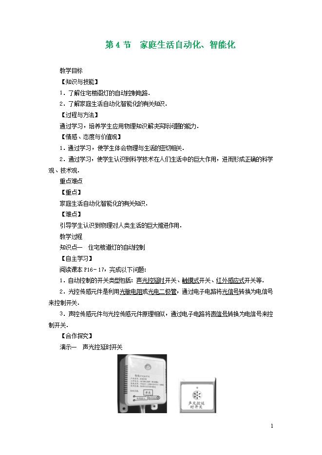 【内容简介】引导学生认识到物理对人类生活的巨大推进作用.教学过程知识点一 住宅楼道灯的自动控制【自主学习】阅读课本P16-17,完成以下问题:1.自动控制的开关类型包括:声光控延时开关、触摸式开关、红外感应式开关等.2.光控传感元件是利用光敏电阻或光电二极管,通过电子电路将光信号转换为电信号来控制开关.3.声控传感元件与光控传感元件原理相似,通过电子电路将声信号转换为电信号来控制开关.【合作探究】演示一 声光控延时开关