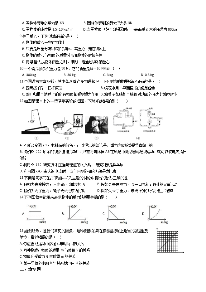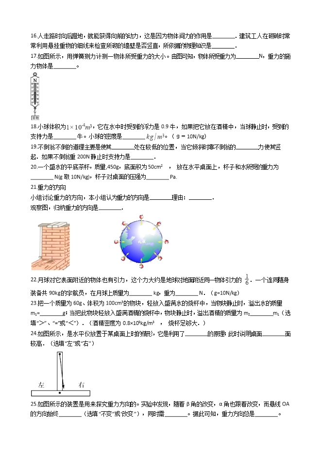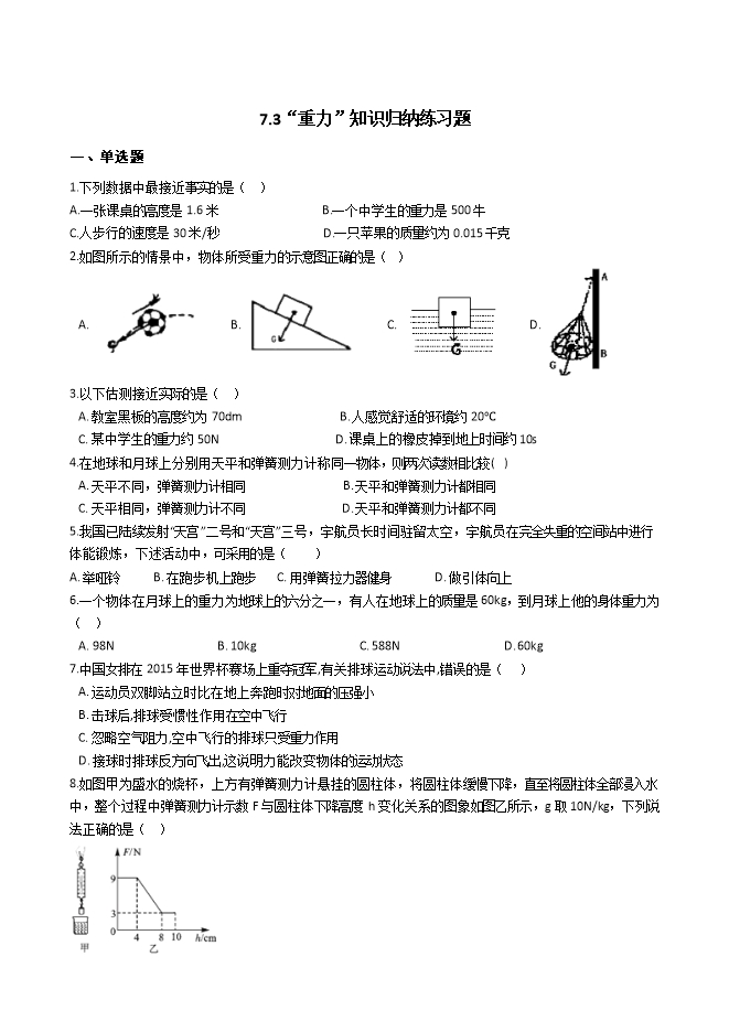 【内容简介】3.以下估测接近实际的是( ) A. 教室黑板的高度约为70dm B. 人感觉舒适的环境约20℃ C. 某中学生的重力约50N D. 课桌上的橡皮掉到地上时间约10s4.在地球和月球上分别用天平和弹簧测力计称同一物体,则两次读数相比较( ) A. 天平不同,弹簧测力计相同 B. 天平和弹簧测力计都相同 C. 天平相同,弹簧测力计不同 D. 天平和弹簧测力计都不同5.我国已陆续发射“天宫”二号和“天宫”三号,宇航员长时间驻留太空,宇航员在完全失重的空间站中进行体能锻炼,下述活动中,可采用的是( )A. 举哑铃 B. 在跑步机上跑步 C. 用弹簧拉力器健身 D. 做引体向上6.一个物体在月球上的重力为地球上的六分之一,有人在地球上的质量是60kg,到月球上他的身体重力为( ) A. 98N B. 10kg C. 588N D. 60kg7.中国女排在2015年世界杯赛场上重夺冠军,有关排球运动说法中,错误的是( ) A. 运动员双脚站立时比在地上奔跑时对地面的压强小 B. 击球后,排球受惯性作用在空中飞行 C. 忽略空气阻力,空中飞行的排球只受重力作用 D. 接球时排球反方向飞出,这说明力能改变物体的运动状态