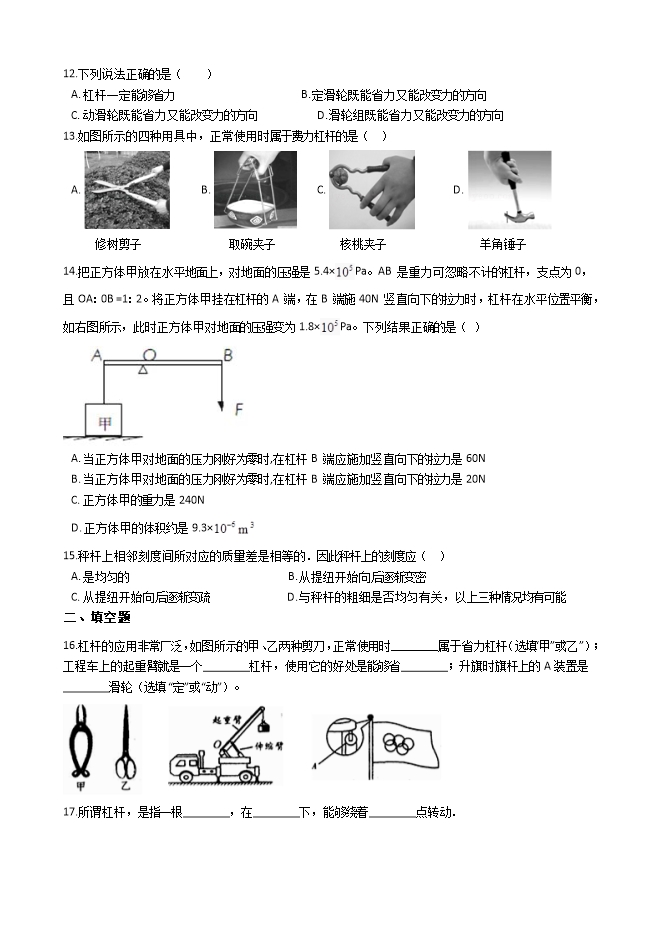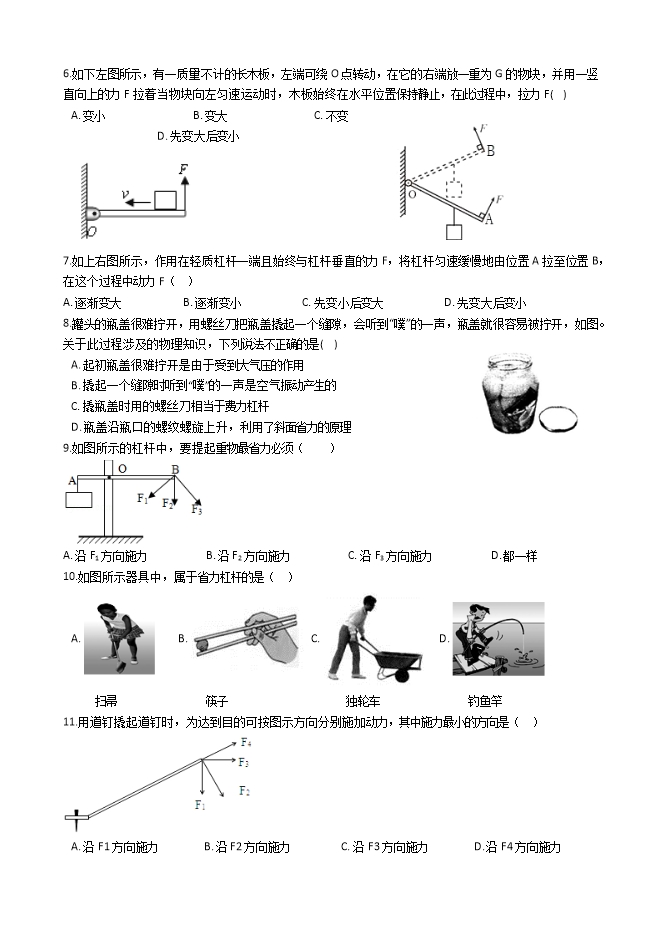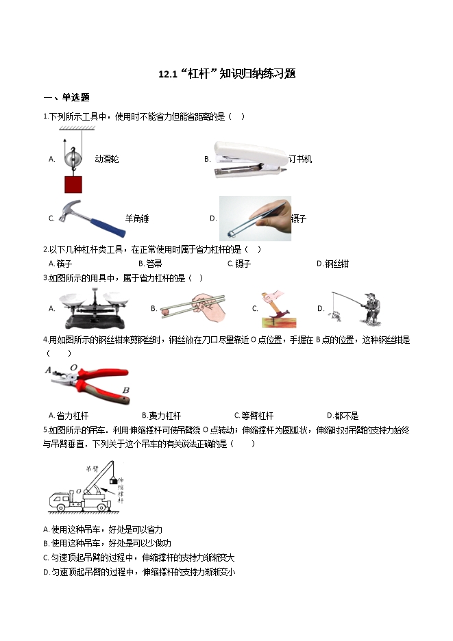 2019-2020人教版八年级物理下册:12.1“杠杆”知识归纳练习题
