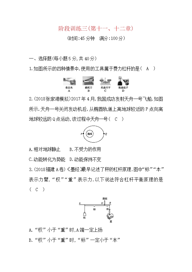 2020春人教版八年级物理下册练习:阶段训练三(第十一、十二章)
