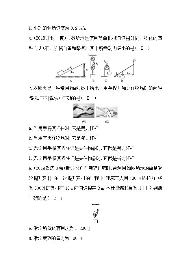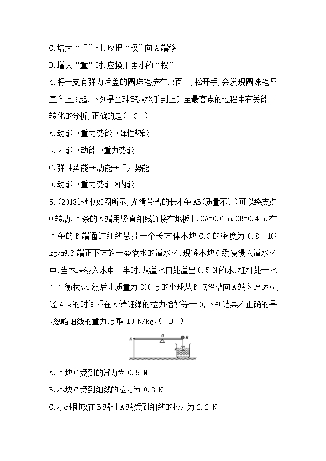 【内容简介】4.将一支有弹力后盖的圆珠笔按在桌面上,松开手,会发现圆珠笔竖直向上跳起.下列是圆珠笔从松手到上升至最高点的过程中有关能量转化的分析,正确的是( C )A.动能→重力势能→弹性势能B.内能→动能→重力势能C.弹性势能→动能→重力势能D.动能→重力势能→内能5.(2018达州)如图所示,光滑带槽的长木条AB(质量不计)可以绕支点O转动,木条的A端用竖直细线连接在地板上,OA=0.6 m,OB=0.4 m.在木条的B端通过细线悬挂一个长方体木块C,C的密度为0.8×103 kg/m3,B端正下方放一盛满水的溢水杯.现将木块C缓慢浸入溢水杯中,当木块浸入水中一半时,从溢水口处溢出0.5 N的水,杠杆处于水平平衡状态.然后让质量为300 g的小球从B点沿槽向A端匀速运动,经4 s的时间系在A端细绳的拉力恰好等于0,下列结果不正确的是(忽略细线的重力,g取10 N/kg)( D )