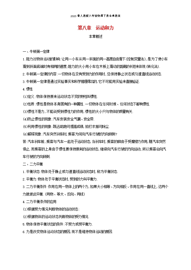 【内容简介】一、牛顿第一定律1.阻力对物体运动的影响:让同一小车从同一斜面的同一高度自由滑下(控制变量法),是为了使小车滑到斜面底端时有相同的速度;阻力的大小用小车在木板上滑动的距离的长短来体现(转化法).2.牛顿第一定律的内容:一切物体在没有受到力的作用时,总保持静止状态或匀速直线运动状态.3.牛顿第一定律是通过实验事实和科学推理得出的,它不可能用实验来直接验证.4.惯性(1)定义:物体保持原来运动状态不变的特性叫惯性.(2)性质:惯性是物体本身固有的一种属性.一切物体在任何时候、任何状态下都有惯性.(3)惯性不是力,不能说受到惯性力的作用,惯性的大小只与物体的质量有关.(4)防止惯性的现象:汽车安装安全气囊、安全带.(5)利用惯性的现象:跳远助跑可提高成绩,拍打衣服可除尘.(6)解释现象:汽车突然刹车时,乘客为何向汽车行驶的方向倾倒?答:汽车刹车前,乘客与汽车一起处于运动状态,当刹车时,乘客的脚由于受摩擦力作用,随汽车突然停止,而乘客的上身由于惯性要保持原来的运动状态,继续向汽车行驶的方向运动,所以乘客会向汽车行驶的方向倾倒.二、二力平衡1.平衡状态:物体处于静止或匀速直线运动状态时,称为平衡状态.2.平衡力:物体处于平衡状态时,受到的力叫平衡力.3.二力平衡条件:作用在同一物体上的两个力,如果大小相等、方向相反、作用在同一直线上,这两个力就彼此平衡.(同物、等大、反向、同线)4.二力平衡条件的应用