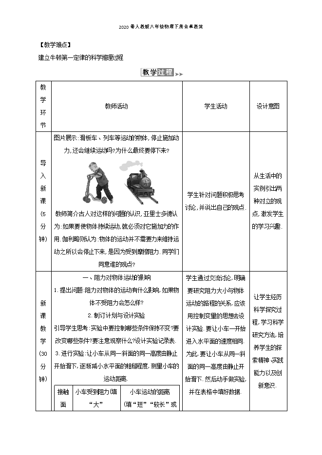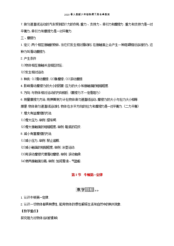 2020春人教版八年级物理下册全章教案:第八章 运动和力