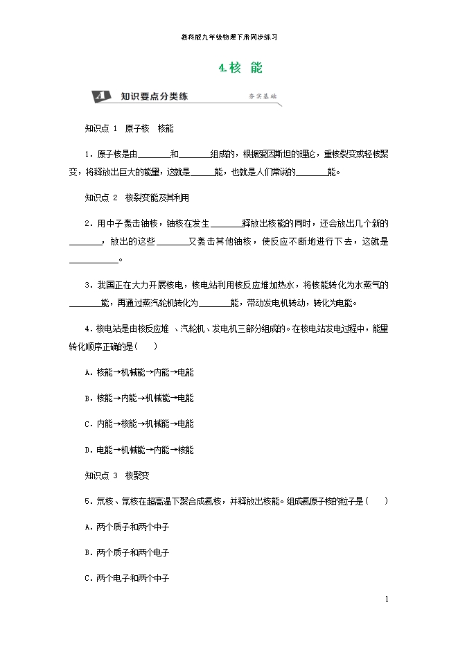 【内容简介】知识点 1 原子核 核能1.原子核是由________和________组成的,根据爱因斯坦的理论,重核裂变或轻核聚变,将释放出巨大的能量,这就是______能,也就是人们常说的________能。知识点 2 核裂变能及其利用2.用中子轰击铀核,铀核在发生________释放出核能的同时,还会放出几个新的________,放出的这些________又轰击其他铀核,使反应不断地进行下去,这就是____________。3.我国正在大力开展核电,核电站利用核反应堆加热水,将核能转化为水蒸气的________能,再通过蒸汽轮机转化为________能,带动发电机转动,转化为电能。4.核电站是由核反应堆 、汽轮机、发电机三部分组成的。在核电站发电过程中,能量转化顺序正确的是( )A.核能→机械能→内能→电能B.核能→内能→机械能→电能C.内能→核能→机械能→电能D.电能→机械能→内能→核能知识点 3 核聚变5.氘核、氚核在超高温下聚合成氦核,并释放出核能。组成氦原子核的粒子是( )A.两个质子和两个中子B.两个质子和两个电子C.两个电子和两个中子...........