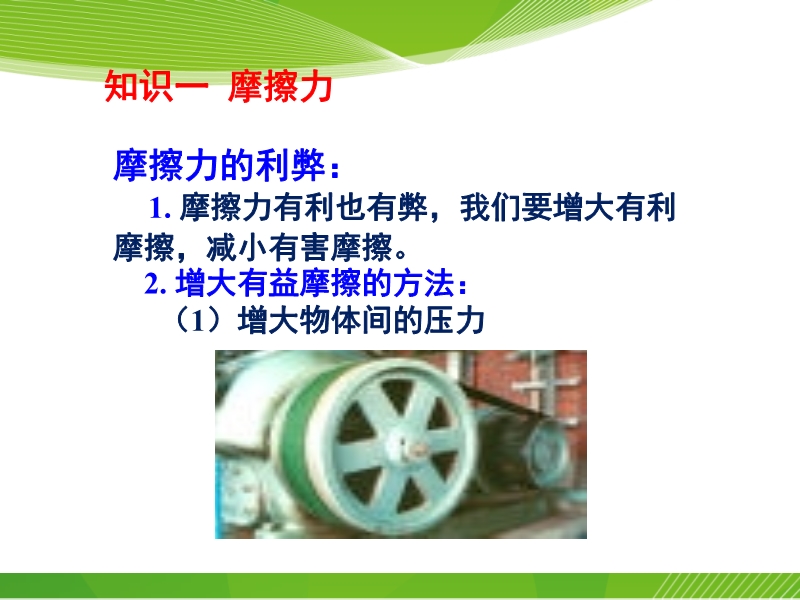 【内容简介】摩擦力的利弊: 1. 摩擦力有利也有弊,我们要增大有利摩擦,减小有害摩擦。 2. 增大有益摩擦的方法: (1)增大物体间的压力 自行车在运动过程中有很多相接触的部件都有摩擦。车胎、车手把、脚踏板等,上面有花纹,利用 来增大有益摩擦;刹车时使劲握车闸,是利用增大闸皮和车圈之间的 来增大有益摩擦;在车轴内装钢珠,是利用 来减小摩擦;定期加润滑油,是利用 ,从而减小摩擦.
