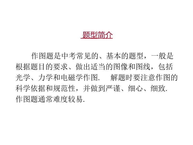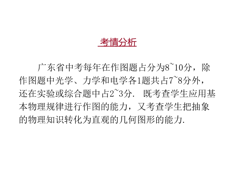 【内容简介】作图题是中考常见的、基本的题型,一般是根据题目的要求、做出适当的图像和图线,包括光学、力学和电磁学作图. 解题时要注意作图的科学依据和规范性,并做到严谨、细心、细致. 作图题通常难度较易.广东省中考每年在作图题占分为8~10分,除作图题中光学、力学和电学各1题共占7~8分外,还在实验或综合题中占2~3分. 既考查学生应用基本物理规律进行作图的能力,又考查学生把抽象的物理知识转化为直观的几何图形的能力在复习过程中,要在巩固光现象、透镜及其应用、力、简单机械、电流和电路、生活用电和电与磁等章节知识要点的基础上,有针对性地对相关作图题进行强化训练.