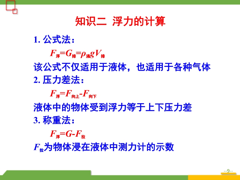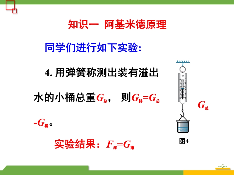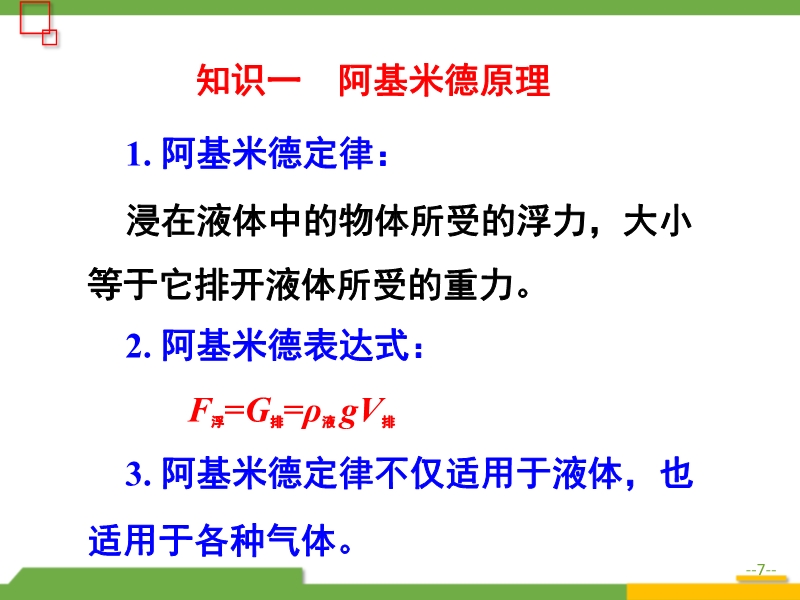 【内容简介】1. 阿基米德定律:浸在液体中的物体所受的浮力,大小等于它排开液体所受的重力。2. 阿基米德表达式: F浮=G排=ρ液 gV排3. 阿基米德定律不仅适用于液体,也适用于各种气体。利用公式:F浮=ρ液 gV排可以测浮力,反过来,利用公式ρ液=F浮/gV排也可以测液体的密度。如果我们要测量物体的密度,可以用排液法来求出物体浸在液体中的体积V排。