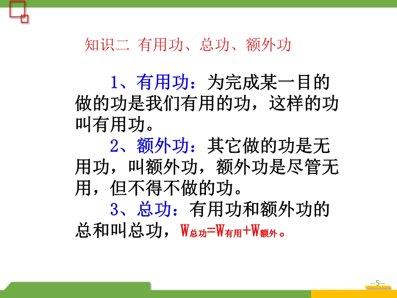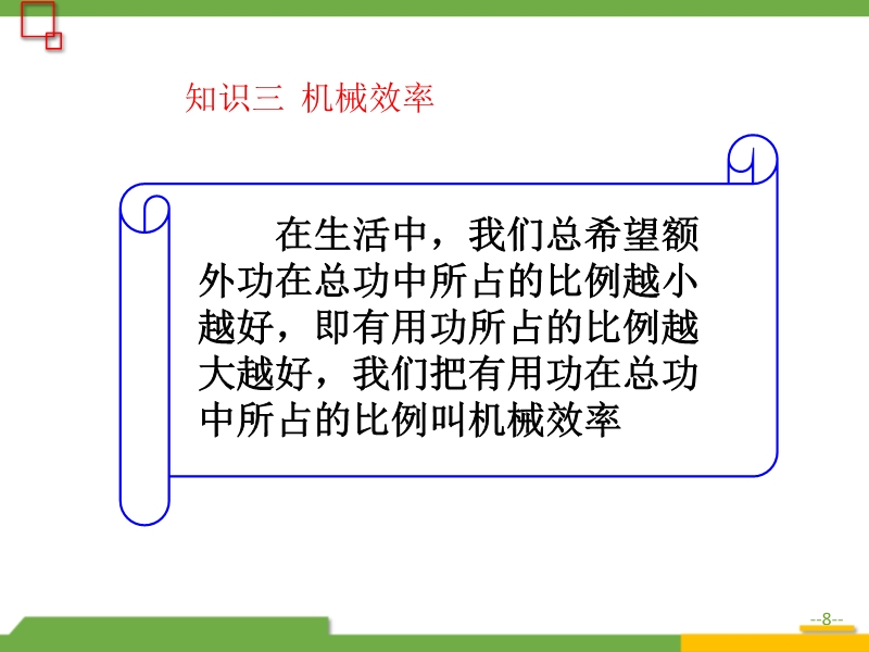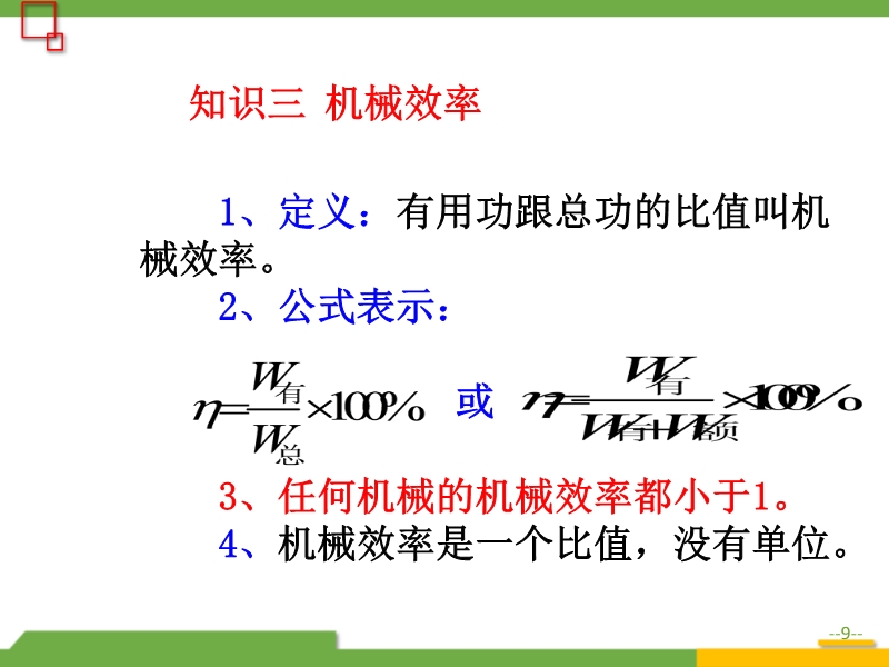 【内容简介】 1、有用功:为完成某一目的做的功是我们有用的功,这样的功叫有用功。 2、额外功:其它做的功是无用功,叫额外功,额外功是尽管无用,但不得不做的功。 3、总功:有用功和额外功的总和叫总功,W总功=W有用+W额外。在生活中,我们总希望额外功在总功中所占的比例越小越好,即有用功所占的比例越大越好,我们把有用功在总功中所占的比例叫机械效率1、定义:有用功跟总功的比值叫机械效率。 2、公式表示: 3、任何机械的机械效率都小于1。 4、机械效率是一个比值,没有单位。