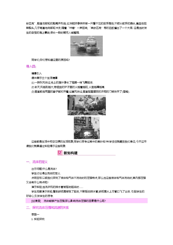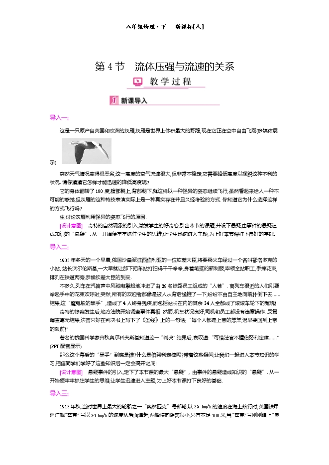 【内容简介】这是一只原产自英国和欧洲的灰雁,灰雁是世界上体积最大的野鹅,现在它正在空中自由飞翔(多媒体展示). 突然天气情况变得很恶劣,这一高度的空气流速很大,但非常不稳定,它需要降低高度以摆脱这种不利的状况.请你猜猜它怎样才能迅速的降低高度呢? 它的身体翻转了180度,腹部朝上,背部朝下,就这样以一种怪异的姿态继续飞行,虽然看起来给人一种不可能的感觉,但灰雁的这种特技表演实际上是一种真实存在并且久经考验的方式.你知道它为什么选择这样的方式飞行吗?生:讨论灰雁利用怪异的姿态飞行的原因.[设计意图] 奇特的自然现象的引入,激发学生的好奇心,引出本节的课题,并设下悬疑,由事件的悬疑造成知识的“悬疑”.从一开始便牢牢抓住学生的思维,让学生迅速进入主题,为上好本节课打下良好的基础.导入二:1905年冬天的一个早晨,俄国沙皇派往西伯利亚的一位钦差大臣,将要乘火车经过一个名叫鄂洛多克的小站.站长沃尔伦斯基,一大早就让部下把车站打扫得干干净净,身着笔挺的新制服,率领全站职工,手捧花束,排列在铁道两旁,恭候钦差大臣的到来.不多久,列车在汽笛声中风驰电掣般地冲进了由38名铁路员工组成的“人巷”.离列车很近的人们刚要举起手中的花束欢呼时,突然,所有的欢迎者都像是被人从背后猛推了一下,纷纷不由自主地向前扑倒下去……结果,这“魔鬼般的黑手”,造成了4人终身残疾,而包括站长在内的其余34人全都成了滚滚车轮下的冤魂!奇特的惨案发生后,地方法院开始调查事件真相.然而,机车状况良好,司机和员工都没有违章操作.反复调查毫无结果,法官只好在判决书上写下了《圣经》上的一句话:“每个人都是上帝的羔羊,迟早要回到上帝的跟前!”著名的俄国科学家齐秋奥尔科夫斯基知道这一“判决”结果后,哀叹道:“可惜法官不懂伯努利定律……”(PPT配音显示)那么这个幕后的“黑手”到底是谁?什么是伯努利定律呢?带着这些疑问,让我们一起进入本节知识的学习,相信同学们学好了这些知识后一定会揭开谜底!