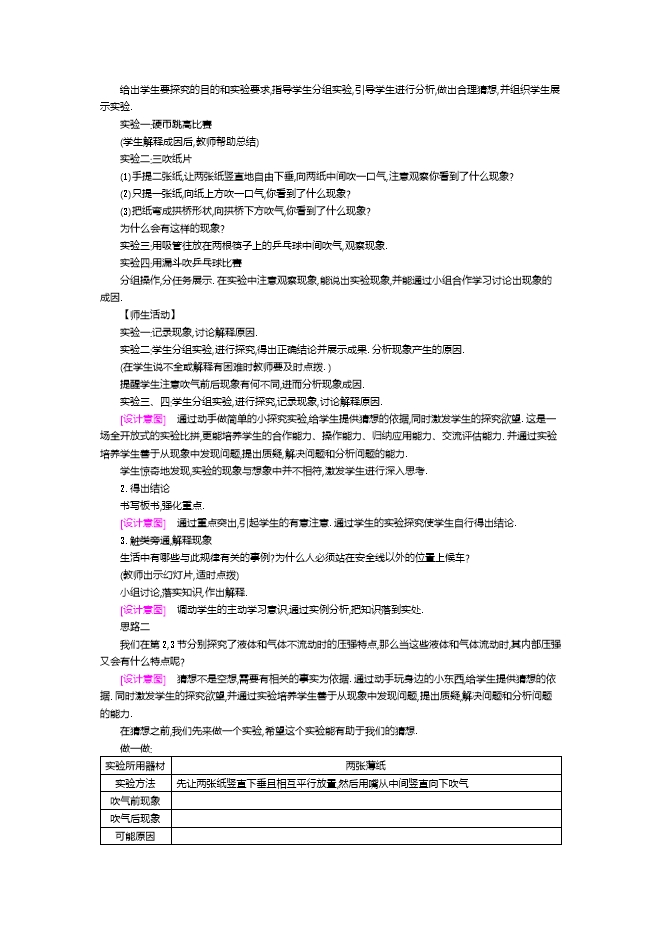 - 7982025春人教版八年级下册物理教学设计:9.5 流体压强与流速的关系(附教学反思)