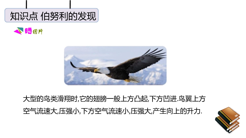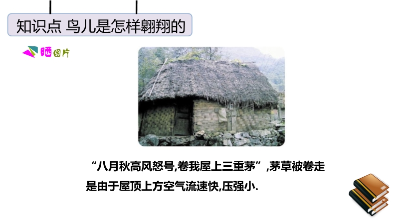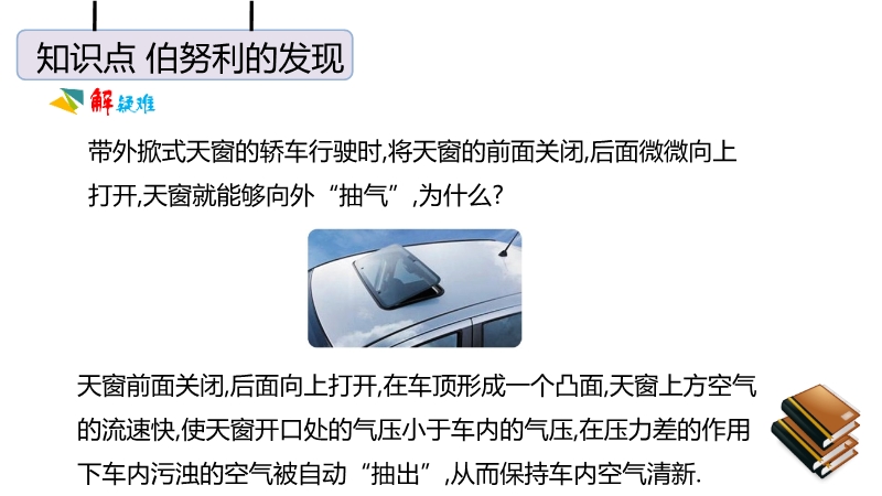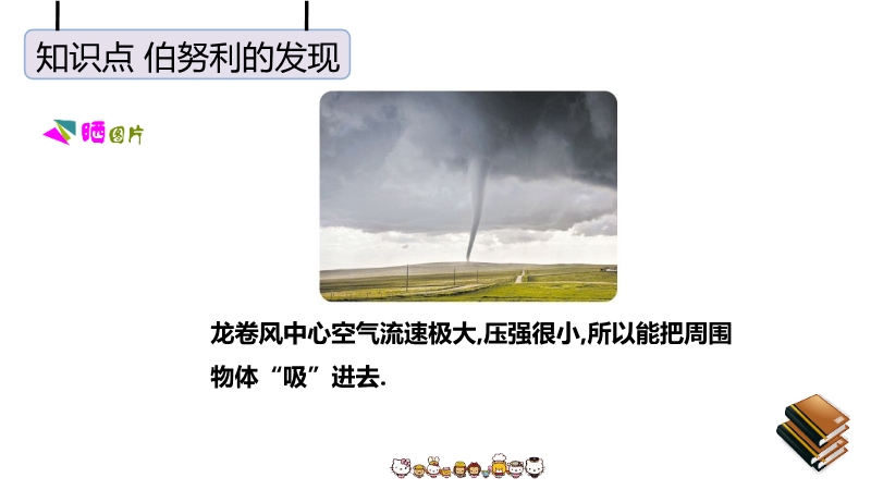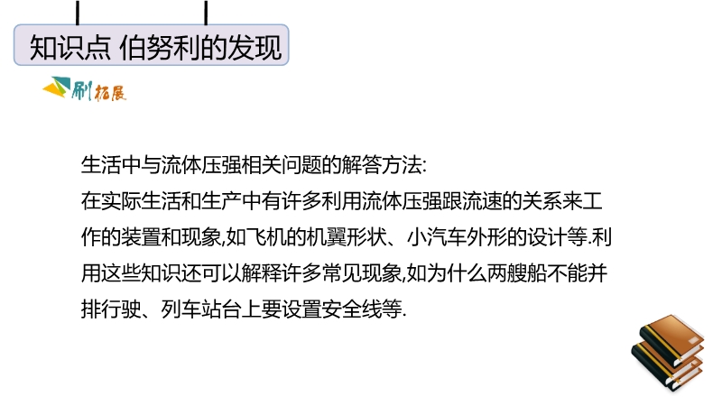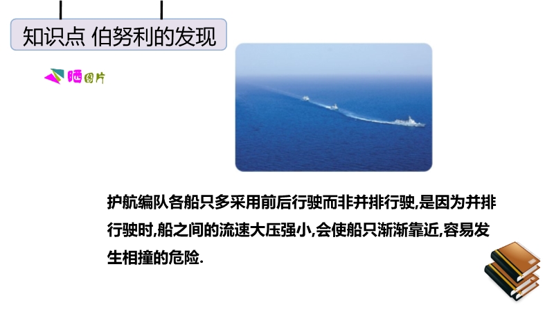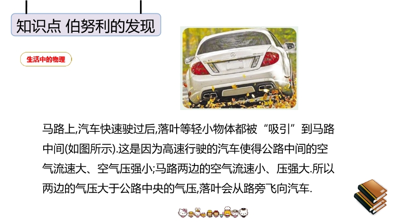 【内容简介】“八月秋高风怒号,卷我屋上三重茅”,茅草被卷走是由于屋顶上方空气流速快,压强小.护航编队各船只多采用前后行驶而非并排行驶,是因为并排行驶时,船之间的流速大压强小,会使船只渐渐靠近,容易发生相撞的危险.龙卷风中心空气流速极大,压强很小,所以能把周围物体“吸”进去.生活中与流体压强相关问题的解答方法:在实际生活和生产中有许多利用流体压强跟流速的关系来工作的装置和现象,如飞机的机翼形状、小汽车外形的设计等.利用这些知识还可以解释许多常见现象,如为什么两艘船不能并排行驶、列车站台上要设置安全线等.马路上,汽车快速驶过后,落叶等轻小物体都被“吸引”到马路中间(如图所示).这是因为高速行驶的汽车使得公路中间的空气流速大、空气压强小;马路两边的空气流速小、压强大.所以两边的气压大于公路中央的气压,落叶会从路旁飞向汽车.对于流速和流体压强的问题,一定要明确被研究的物体的两个面的流体流速,用流速来分析流体压强,用压强来分析压力,通过压力差来分析物体受到的作用.
