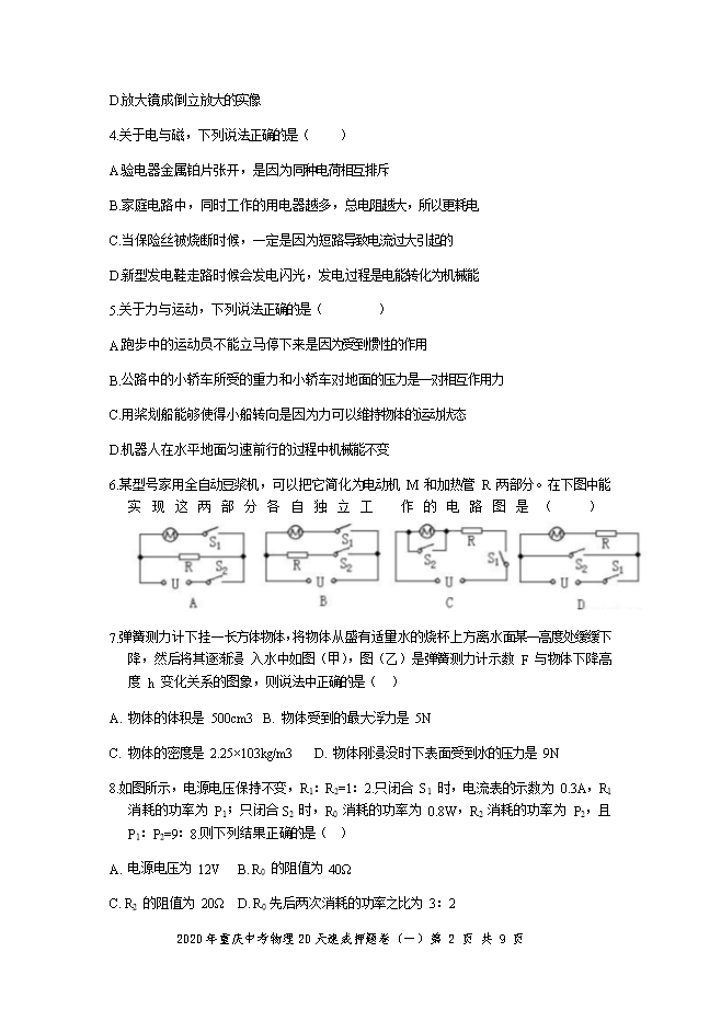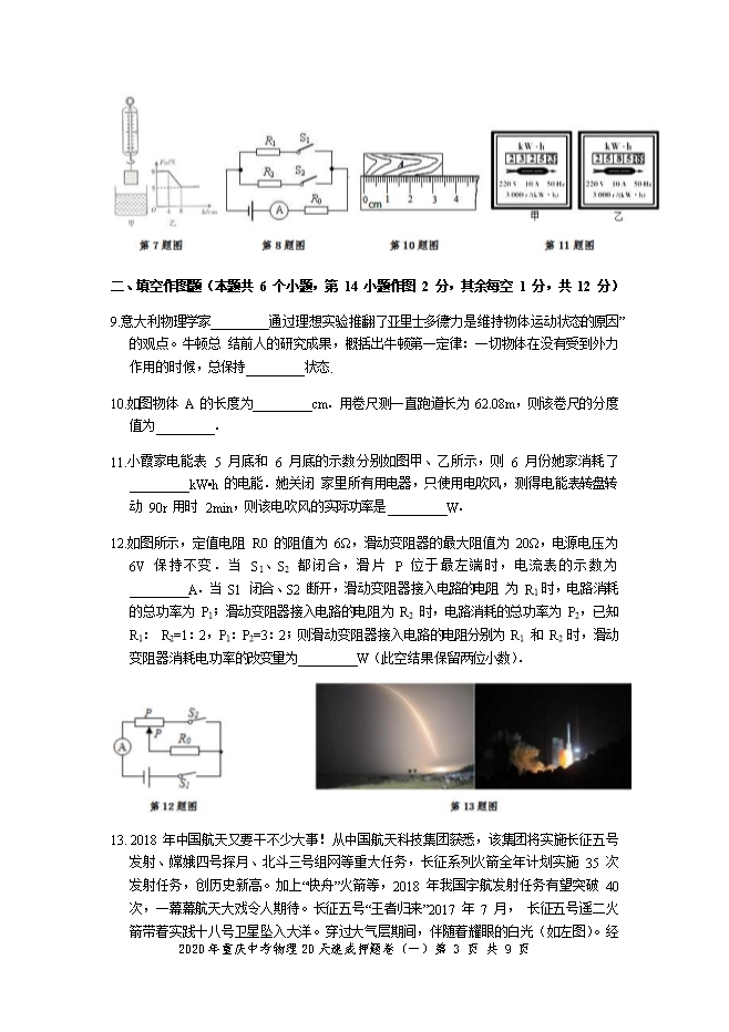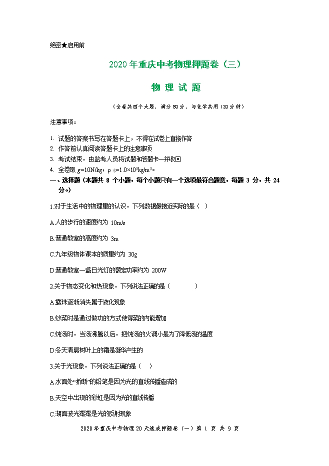 2020年重庆中考物理速成押题卷及答案(三)(word版)