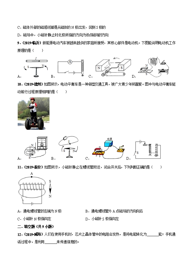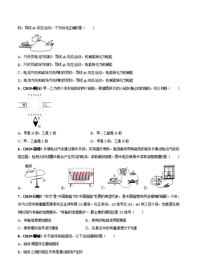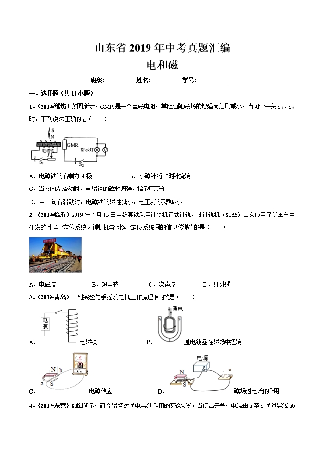【内容简介】1.(2019•潍坊)如图所示,GMR是一个巨磁电阻,其阻值随磁场的增强而急剧减小,当闭合开关S1、S2时,下列说法正确的是( ) A.电磁铁的右端为N极B.小磁针将顺时针旋转C.当p向左滑动时,电磁铁的磁性增强,指示灯变暗D.当P向右滑动时,电磁铁的磁性减小,电压表的示数减小【答案】D。【解析】(1)根据安培定则可知,电磁铁的左端为N极,右端为S极,根据磁极间的相互作用可知,右侧的小磁针将会逆时针旋转,故AB错误;(2)闭合开关S1和S2,使滑片P向左滑动,电阻变小,电流变大,磁场的磁性增强,巨磁电阻的阻值减小,电路电流变大,所以指示灯的亮度会变亮,故C错误。使滑片P向右滑动,电阻变大,电流变小,磁场的磁性变弱,巨磁电阻的阻值变大,电路电流变小,根据U=IR可知,灯泡两端的电压减小,电压表示数变小,故D正确。2.(2019•临沂)2019年4月15日京雄高铁采用铺轨机正式铺轨,此铺轨机(如图)首次应用了我国自主研发的“北斗”定位系统。铺轨机与“北斗”定位系统间的信息传递靠的是( ) A.电磁波B.超声波C.次声波D.红外线【答案】A。【解析】我国自主研发的“北斗”定位系统是利用电磁波进行定位的,所以铺轨机与“北斗”定位系统间的信息传递靠的是电磁波,故A正确,BCD错误。3.(2019•青岛)下列实验与手摇发电机工作原理相同的是( )......