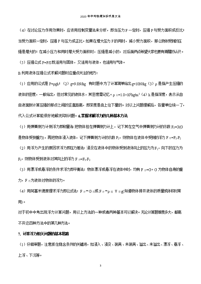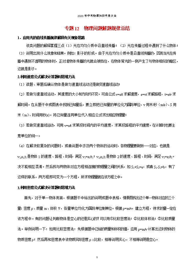 【内容简介】1.应用光的直线传播规律解释有关现象思路该类问题的解释掌握三点(1)光在均匀介质中沿直线传播;(2)光在传播过程中遇到了什么物体;(3)说明出现什么现象和结果。例如:影子的形成。由于光在均匀介质中是沿直线传播的,因而当光在传播中遇到不透明的物体时,正对准物体传播的光就会被挡住,在物体背光的一侧产生了与物体相似的暗区,这就是影子。2.利用速度公式解决计算题时思维方法(1)读题、审题后确认物体是做匀速直线运动还是做变速直线运动;(2)若做匀速直线运动,其速度的大小和方向均不变。可由公式v=s/t求解速度,s=vt求解路程,t=s/v求解时间。在从题干中或图表中找到已知量后,要立即把已知量的单位化为国际单位,v用米/秒(m/s)、S用米(m)、时间用秒(s)。将已知量连同单位代入相应公式求出相应物理量;(3)若做变速直线运动,可用v=s/t求某段时间内的平均速度,求某段路程的平均速度。在计算时也要注意单位的统一。(4)在解决较复杂的问题时,或者说题中涉及两个物体的运动时,各物理量要做到一一对应,也就是v1,s1,t1是物体1的速度、路程、时间,满足v1=s1/t1;v2,s2,t2是物体2的速度、路程、时间,满足v2=s2/t2。决不能相互混淆。然后找与两物体对应方程相连接的物理量之间的关系,如S1+S2=a,或者S1-S2=b,有了这样的联系,两方程即可变为一个方程,所求物理量就在该方程之中。3.利用密度公式解决计算题时思维方法首先,对于单一物体而言,根据题干中给出的说明或题中表格,情景图找出这个单一物体对应的三个量:密度ρ、质量m、体积V,各量单位均化为国际单位制单位。根据ρ=m/v,建立方程,待求的量一定在该方程中。有的问题让判断物体是空心的还是实心的?可以用①比较密度法;②比较体积法;③比较质量法。举例说明一下:如用比较密度法:先根据题中已给的质量和体积的值,应用ρ=m/v计算出这时物体的物质密度ρ;然后再和密度表中该物质实际密度ρ真比较,相等说明实心,不相等说明是空心。其次,在多数应用题中,会出现两种物质存在的情况。处理办法就是阅读题干后找出一物体相对应的三个物理量ρ1、m1、V1,立即给出联系ρ1=m1/V1;再找出另一物体相对应的三个物理量ρ2、m2、V2,各量的单位统一后,立即用密度公式联系ρ2=m2/V2。建立两个方程后,再审题、读题、观察表格、图象,找出两个物体在质量上存在什么联系,或找出两个物体在体积上存在什么联系。即m1=am2或V1=aV2,用这个联系就把上述建立的两个方程化为一个方程,待求的量就含在(或隐含在)这个方程之中,解之即可!最后,就是在应用密度公式解决计算类问题时,需要注意如下的几个方面:①各量要体现出一一对应的关系;②各量的单位均用国际单位制单位;③解题书写过程要规范化,思路清晰。4.判断物体是“空心”还是“实心”的方法(1)比较密度:根据公式ρ物=m物/ V物,求出ρ物,再与该物质密度ρ比较,若ρ物<ρ,则为空心,若ρ物=ρ,为实心。(2)比较体积:把物体作为实心物体对待,由公式V=m/ρ,求出V,再与V物比较。若V<V物,则该物体为空心,若V= V物,则该物体为实心。(3)比较质量:把物体作为实心物体对待,由公式m=ρV,求出体积为V的实心物体的质量,然后将m与物体实际质量m物比较,若m>m物,则该物体为空心,若m=m物,则该物体为实心。5.利用压强公式解决计算题时思维方法A.对压强公式P=F/S的理解:(1)压力F的大小不一定等于重力,方向也不一定是竖直向下。压力与物体表面垂直;(2)受力面积S是指物体相互挤压的面积,与物体表面积不一定相等,可以等于或小于物体表面积,但绝对不会大于物体的表面积。(3)在理解了压力和受力面积之后,运用压强公式计算时,F的单位是牛顿(N),受力面积S的单位要用