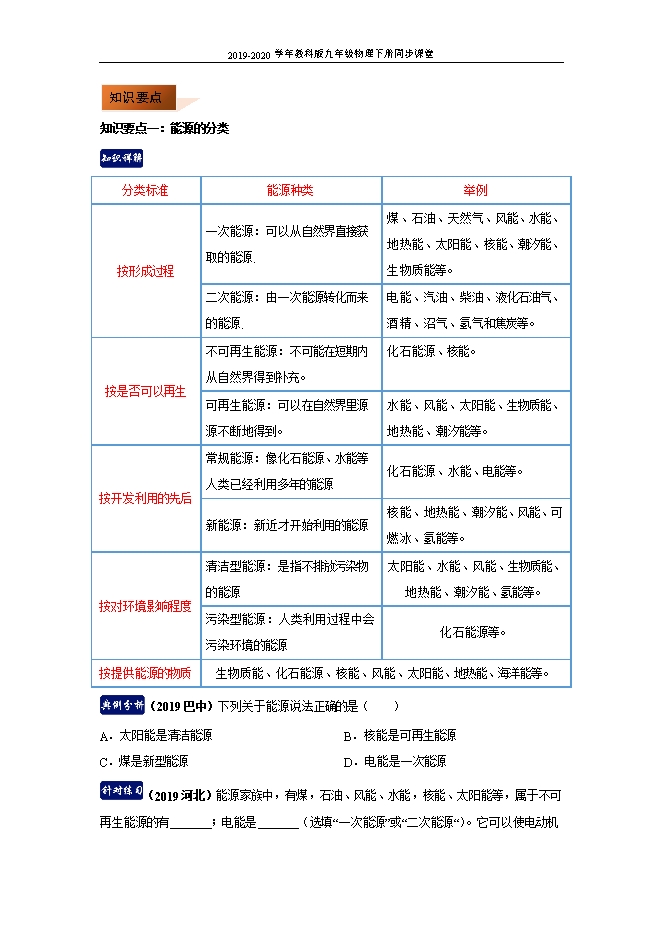 【内容简介】知识要点一:能源的分类 分类标准能源种类举例按形成过程一次能源:可以从自然界直接获取的能源.煤、石油、天然气、风能、水能、地热能、太阳能、核能、潮汐能、生物质能等。二次能源:由一次能源转化而来的能源.电能、汽油、柴油、液化石油气、酒精、沼气、氢气和焦炭等。按是否可以再生不可再生能源:不可能在短期内从自然界得到补充。化石能源、核能。可再生能源:可以在自然界里源源不断地得到。水能、风能、太阳能、生物质能、地热能、潮汐能等。按开发利用的先后常规能源:像化石能源、水能等人类已经利用多年的能源化石能源、水能、电能等。新能源:新近才开始利用的能源核能、地热能、潮汐能、风能、可燃冰、氢能等。按对环境影响程度 清洁型能源:是指不排放污染物的能源太阳能、水能、风能、生物质能、地热能、潮汐能、氢能等。污染型能源:人类利用过程中会污染环境的能源化石能源等。按提供能源的物质生物质能、化石能源、核能、风能、太阳能、地热能、海洋能等。 (2019巴中)下列关于能源说法正确的是( )A.太阳能是清洁能源B.核能是可再生能源C.煤是新型能源D.电能是一次能源【答案】A【解析】A.太阳能安全、清洁,开发利用太阳能不会给环境带来污染,叫做清洁能源。故A正确;B.核能属于新能源,但核材料的储量是一定的,所以属于不可再生能源。故B错误;C.煤是传统能源,也叫做常规能源。故C错误;D.电能是由其他能源转化来的,属于二次能源。故D错误。故选:A。..........