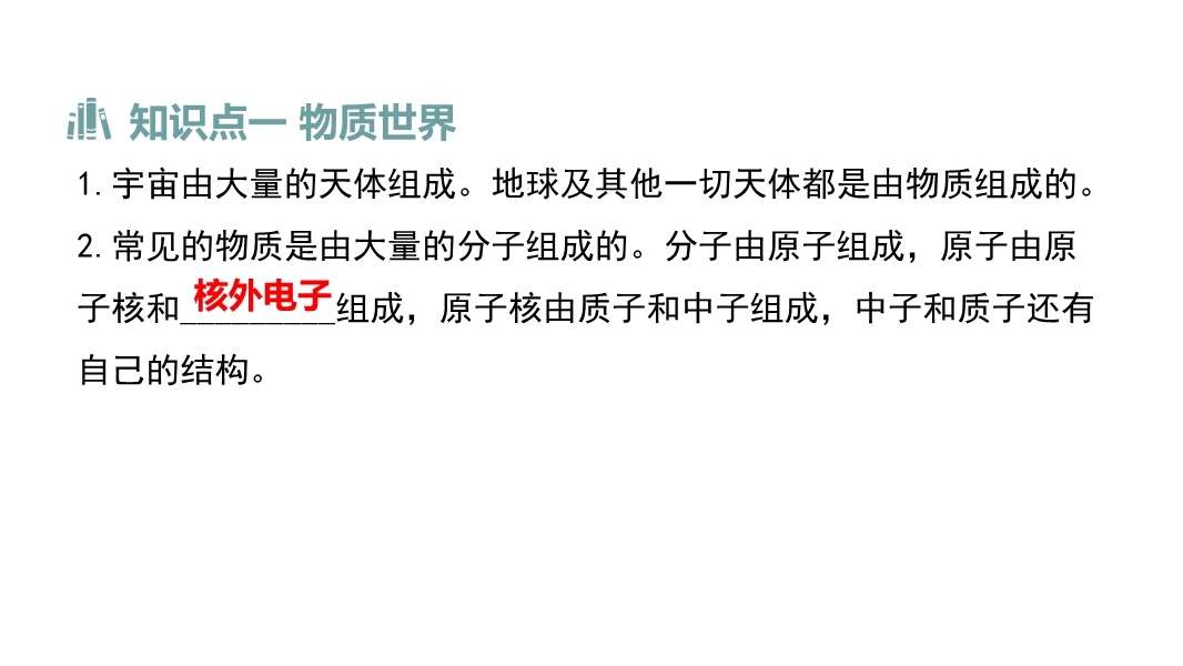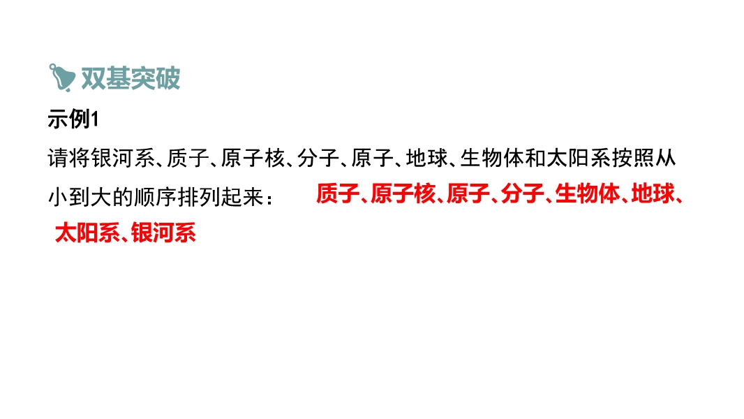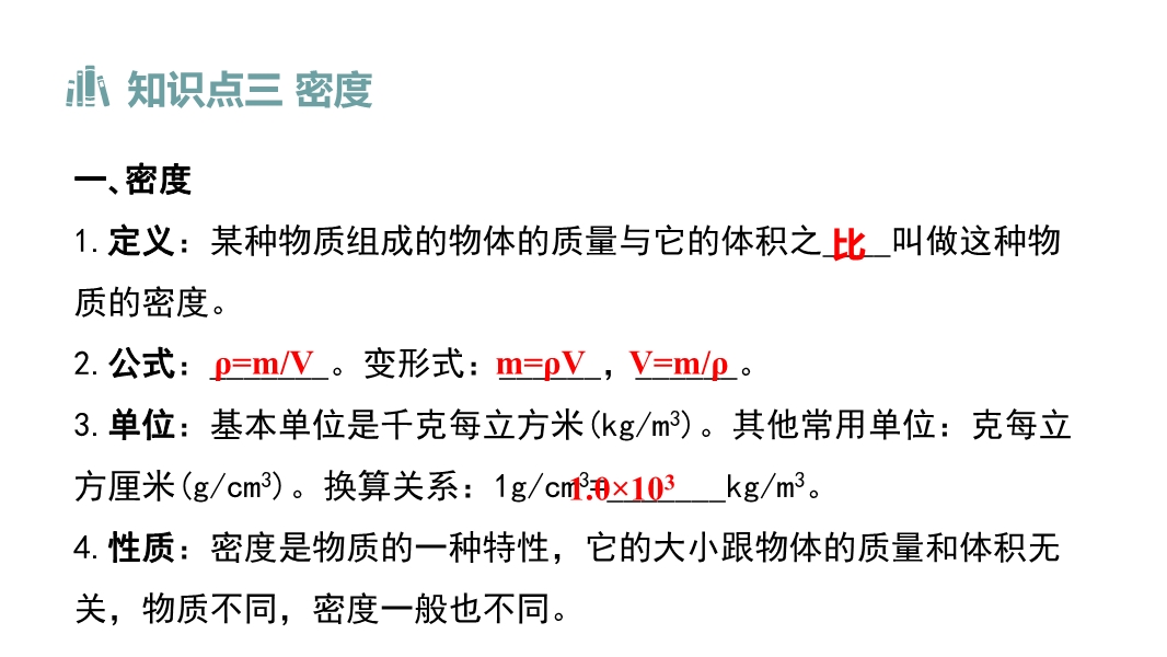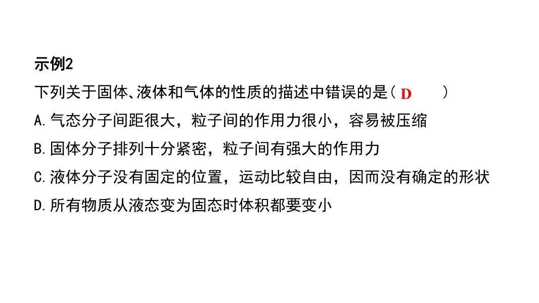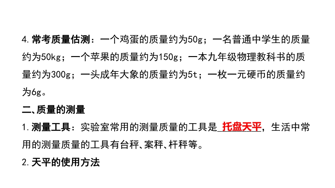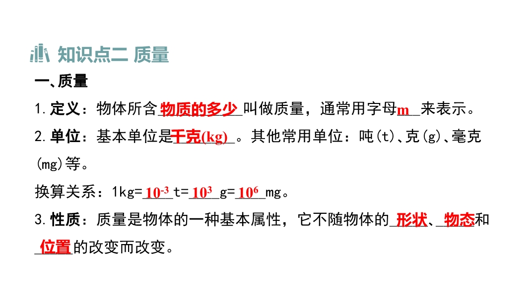 【内容简介】知识点一 物质世界1.宇宙由大量的天体组成。地球及其他一切天体都是由物质组成的。2.常见的物质是由大量的分子组成的。分子由原子组成,原子由原子核和_________组成,原子核由质子和中子组成,中子和质子还有自己的结构。示例1请将银河系、质子、原子核、分子、原子、地球、生物体和太阳系按照从小到大的顺序排列起来:。下列关于固体、液体和气体的性质的描述中错误的是( )A.气态分子间距很大,粒子间的作用力很小,容易被压缩B.固体分子排列十分紧密,粒子间有强大的作用力C.液体分子没有固定的位置,运动比较自由,因而没有确定的形状D.所有物质从液态变为固态时体积都要变小一、质量1.定义:物体所含___________叫做质量,通常用字母___来表示。2.单位:基本单位是________。其他常用单位:吨(t)、克(g)、毫克(mg)等。换算关系:1kg=____t=____g=____mg。3.性质:质量是物体的一种基本属性,它不随物体的_____、_____和_____的改变而改变。一、质量1.定义:物体所含___________叫做质量,通常用字母___来表示。2.单位:基本单位是________。其他常用单位:吨(t)、克(g)、毫克(mg)等。换算关系:1kg=____t=____g=____mg。3.性质:质量是物体的一种基本属性,它不随物体的_____、_____和_____的改变而改变。.......