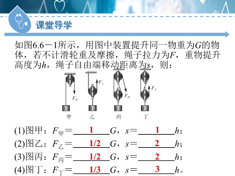 【内容简介】核心考点动滑轮和定滑轮、探究两类滑轮的作用、滑轮组。自主学习1.轴的位置固定不动的滑轮称为 滑轮;定滑轮的实质是一个 杠杆,既不省 ,也不省 ,但可以改变拉力的 。2.轴的位置随被拉物体一起运动的滑轮称为 滑轮,其实质是一个动力臂是阻力臂 倍的省力杠杆;使用动滑轮省 力,但 (选填“能”或“不能”)改变拉力的方向。课堂导学如图6.6-1所示,用图中装置提升同一物重为G的物体,若不计滑轮重及摩擦,绳子拉力为F,重物提升高度为h,绳子自由端移动距离为s,则:(1)图甲:F甲= G,s= h;(2)图乙:F乙= G,s= h;(3)图丙:F丙= G,s= h;(4)图丁:F丁= G,s= h。.......