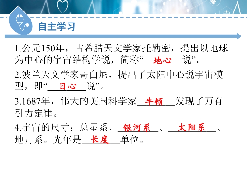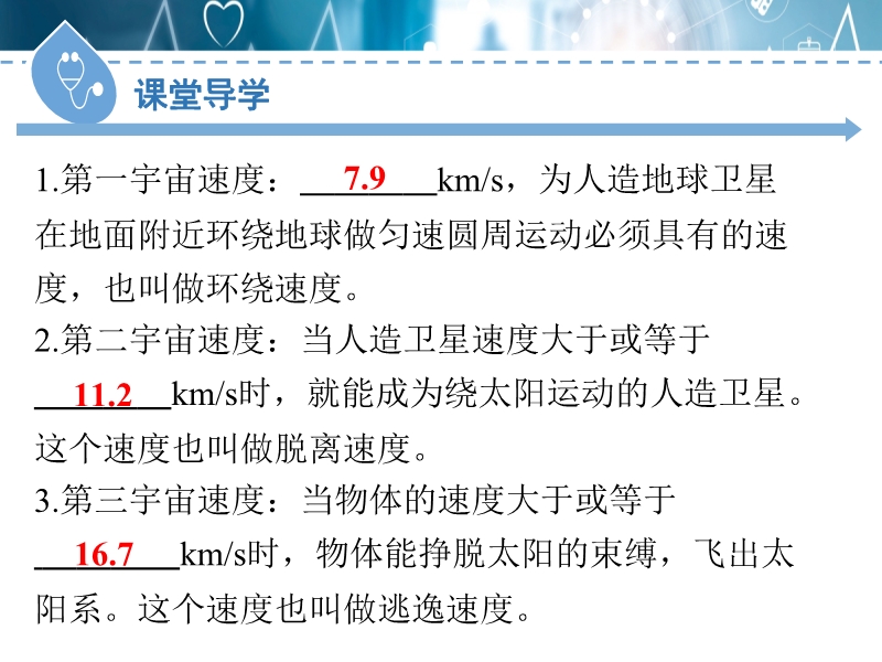 【内容简介】了解人类探索太阳系及宇宙的历程,知道对宇宙的探索将不断深入,关注探索宇宙的一些重大活动、了解物质世界从微观到宏观的大致尺度。1.公元150年,古希腊天文学家托勒密,提出以地球为中心的宇宙结构学说,简称“ 说”。2.波兰天文学家哥白尼,提出了太阳中心说宇宙模型,即“ 说”。3.1687年,伟大的英国科学家 发现了万有引力定律。4.宇宙的尺寸:总星系、 、 、地月系。光年是 单位。课堂导学1.第一宇宙速度: km/s,为人造地球卫星在地面附近环绕地球做匀速圆周运动必须具有的速度,也叫做环绕速度。2.第二宇宙速度:当人造卫星速度大于或等于 km/s时,就能成为绕太阳运动的人造卫星。这个速度也叫做脱离速度。3.第三宇宙速度:当物体的速度大于或等于 km/s时,物体能挣脱太阳的束缚,飞出太阳系。这个速度也叫做逃逸速度。.......