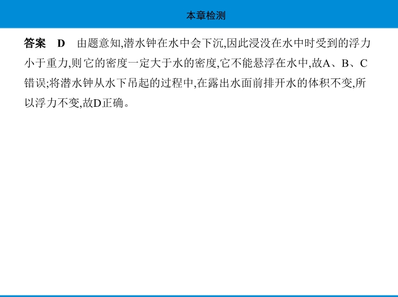 【内容简介】知识点一 浮力知识点二 影响浮力大小的因素 物体在液体中所受浮力的大小,跟它浸在液体中的体积有关,跟液体的密度有关。物体浸在液体中的体积越大、液体的密度越大,浮力就越大。说明 ①浮力的大小与物体浸在液体中的体积V浸有关,跟物体的体积V物无关。②物体浸没时所受浮力与物体浸在液体中的深度无关。知识点 阿基米德原理1.实验:探究浮力的大小跟排开液体所受重力的关系2.计算公式 F浮 =G排=m排g=ρ液V排g。由表达式可知,F浮只与ρ液和V排有关,与“探究浮力的大小跟哪些因素有关”的实验结论一致。3.使用阿基米德原理的注意事项........