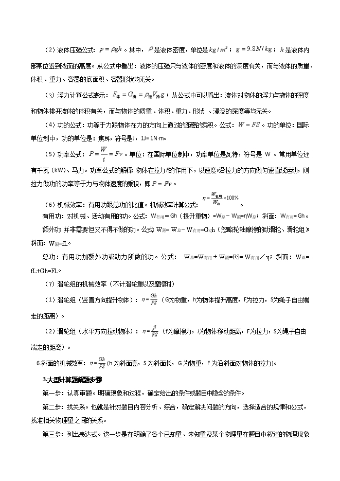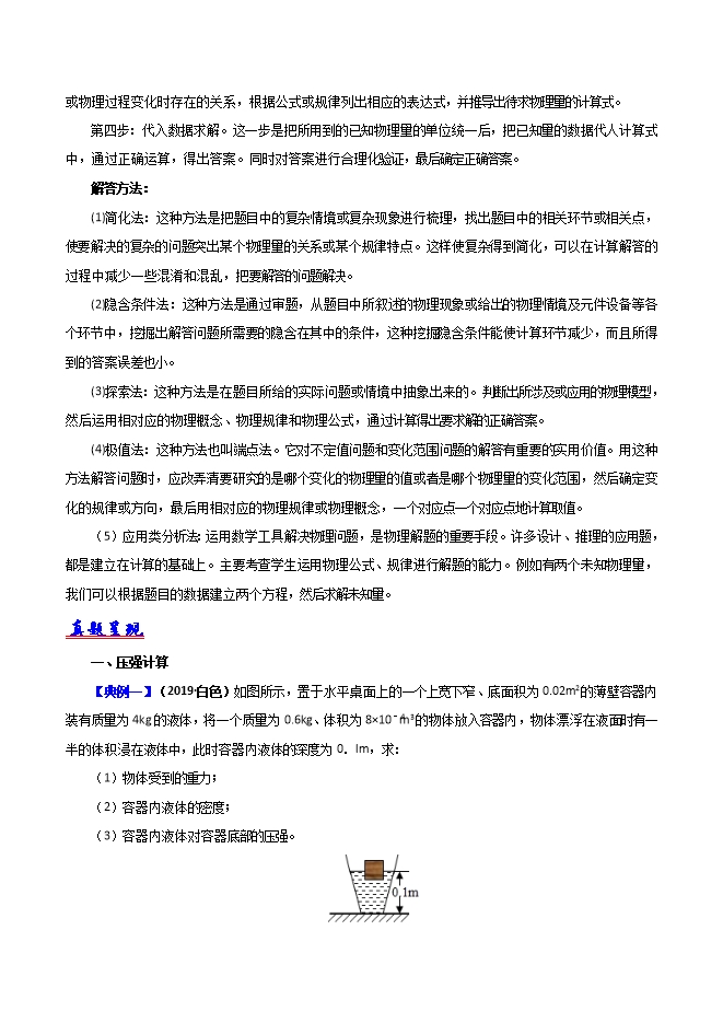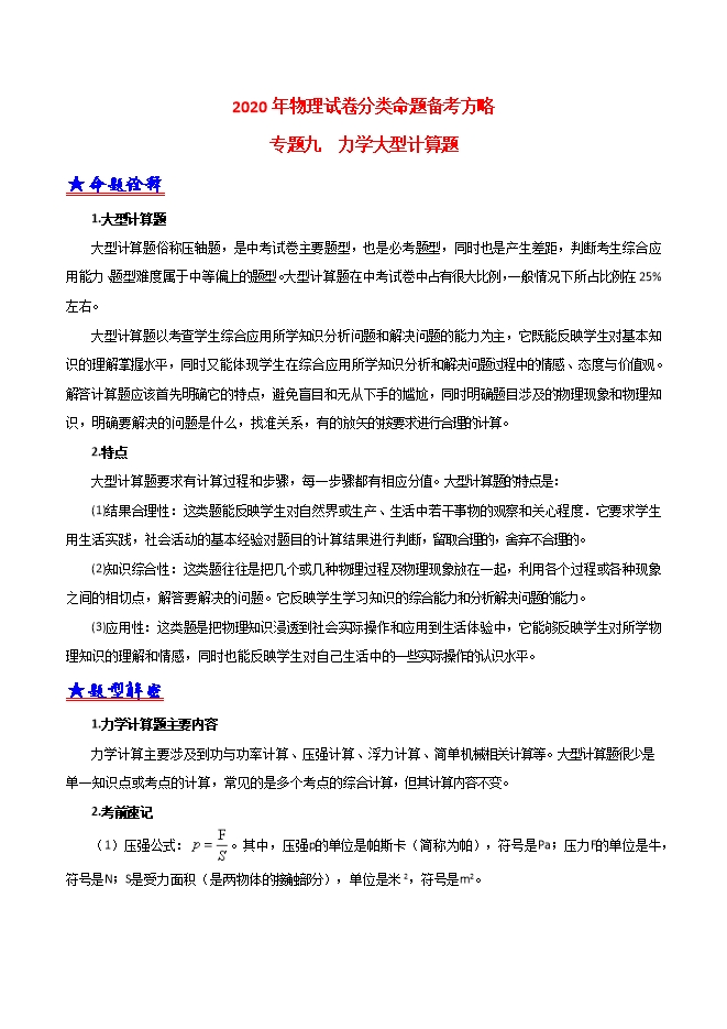 【内容简介】专题九 力学大型计算题★命题诠释1.大型计算题大型计算题俗称压轴题,是中考试卷主要题型,也是必考题型,同时也是产生差距,判断考生综合应用能力、题型难度属于中等偏上的题型。大型计算题在中考试卷中占有很大比例,一般情况下所占比例在25%左右。大型计算题以考查学生综合应用所学知识分析问题和解决问题的能力为主,它既能反映学生对基本知识的理解掌握水平,同时又能体现学生在综合应用所学知识分析和解决问题过程中的情感、态度与价值观。解答计算题应该首先明确它的特点,避免盲目和无从下手的尴尬,同时明确题目涉及的物理现象和物理知识,明确要解决的问题是什么,找准关系,有的放矢的按要求进行合理的计算。2.特点大型计算题要求有计算过程和步骤,每一步骤都有相应分值。大型计算题的特点是:(1)结果合理性:这类题能反映学生对自然界或生产、生活中若干事物的观察和关心程度.它要求学生用生活实践,社会活动的基本经验对题目的计算结果进行判断,留取合理的,舍弃不合理的。(2)知识综合性:这类题往往是把几个或几种物理过程及物理现象放在一起,利用各个过程或各种现象之间的相切点,解答要解决的问题。它反映学生学习知识的综合能力和分析解决问题的能力。(3)应用性:这类题是把物理知识浸透到社会实际操作和应用到生活体验中,它能够反映学生对所学物理知识的理解和情感,同时也能反映学生对自己生活中的一些实际操作的认识水平。★题型解密1.力学计算题主要内容力学计算主要涉及到功与功率计算、压强计算、浮力计算、简单机械相关计算等。大型计算题很少是单一知识点或考点的计算,常见的是多个考点的综合计算,但其计算内容不变。2.考前速记(1)压强公式: 。其中,压强p的单位是帕斯卡(简称为帕),符号是Pa;压力F的单位是牛,符号是N;S是受力面积(是两物体的接触部分),单位是米2,符号是m2。(2)液体压强公式: 。其中, 是液体密度,单位是 ; ; 是液体内部某位置到液面的高度。从公式中看出:液体的压强只与液体的密度和液体的深度有关,而与液体的质量、体积、重力、容器的底面积、容器形状均无关。.......
