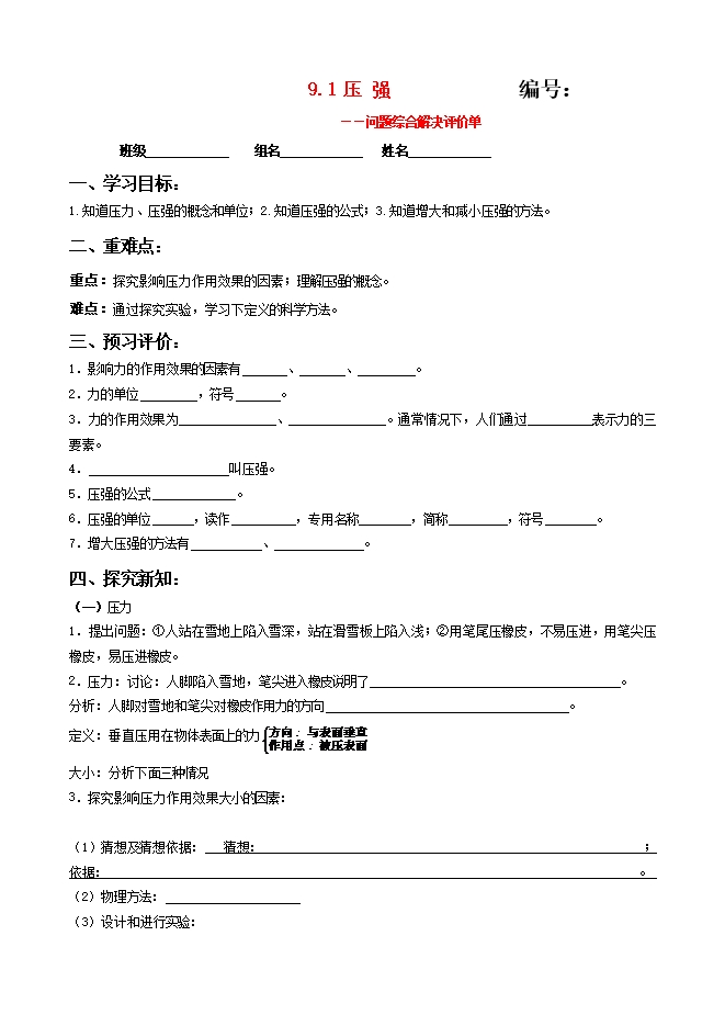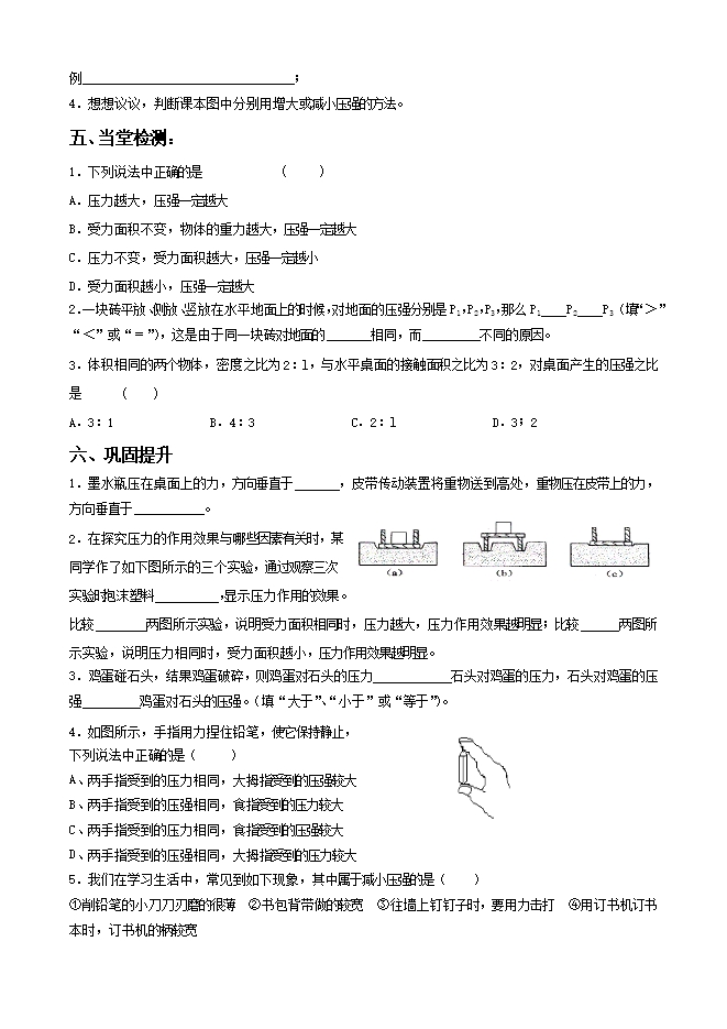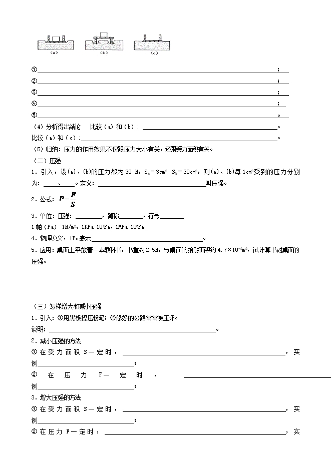 【内容简介】一、学习目标: 1.知道压力、压强的概念和单位;2.知道压强的公式;3.知道增大和减小压强的方法。二、重难点: 重点:探究影响压力作用效果的因素;理解压强的概念。难点:通过探究实验,学习下定义的科学方法。三、预习评价:1.影响力的作用效果的因素有 大小 、 方向 、 作用点 。2.力的单位 牛顿 ,符号 N 。3.力的作用效果为 改变物体的形状 、 改变物体的运动状态 。通常情况下,人们通过 力的示意图 表示力的三要素。4. 物体所受压力的大小与受力面积之比 叫压强。5.压强的公式 。6.压强的单位 N/m2 ,读作 牛每平方米 ,专用名称 帕斯卡 ,简称 帕 ,符号 Pa 。7.增大压强的方法有 增大压力 、 减小受力面积 。四、探究新知:(一)压力1.提出问题:①人站在雪地上陷入雪深,站在滑雪板上陷入浅;②用笔尾压橡皮,不易压进,用笔尖压橡皮,易压进橡皮。2.压力:讨论:人脚陷入雪地,笔尖进入橡皮说明了 受力面积越小,力的作用效果越明显(力的作用效果与受力面积有关) 。分析:人脚对雪地和笔尖对橡皮作用力的方向 垂直于接触的表面 。定义:垂直压用在物体表面上的力 大小:分析下面三种情况3.探究影响压力作用效果大小的因素:(1)猜想及猜想依据: 猜想:压力的作用效果可能与压力大小和受力面积的大小有关;依据:用笔压橡皮时,用力越大时,笔尖压进越深,说明压力的作用效果与压力的大小有关;用同样大小的力压橡皮,笔尖比笔帽压得深,说明压力的作用效果与受力面积有关。 (2)物理方法: 控制变量法和转换法 (3)设计和进行实验: ① 按照如图所示准备一块泡沫,一张小方桌,砝码一套; ② 由图(a)和(b)可知:压力一定时,受力面积越小,小方桌陷入泡沫越深,作用效果越明显; ③ 由图(a)和(c)可知:受力面积一定时,压力越大,小方桌陷入泡沫越深,作用效果越明显; ④ 该实验通过分别控制压力一定和受力面积一定来研究压力的作用效果与受力面积和压力的关系,采用了控制变量法; ⑤ 该实验通过小方桌陷入泡沫的深度来判断压力的作用效果的大小,采用了转换法 。 .......