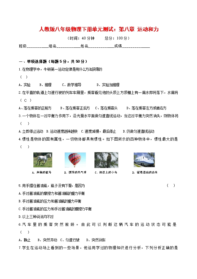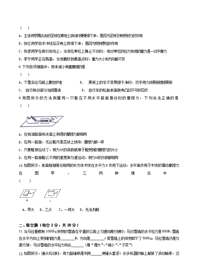 【内容简介】1.在物理学中,牛顿第一运动定律是用什么方法获得的 ( D )A.实验 B.推理 C.数学推导 D.实验加推理2.在平直的轨道上匀速行驶的列车车厢里,乘客看见他的头顶上方顶棚上有一滴水即将落下,水滴将 ( C )A、落在乘客的正前方 B、落在乘客正后方 C、落在乘客头 D、落在乘客左方或者右方3.一个物体在一对平衡力作用下,沿光滑水平面做匀速直线运动,当这对平衡力突然消失,则物体将( D )A.立即停止运动B.运动速度越来越快C.速度减慢,最后停止D.仍做匀速直线运动4.惯性是物体的固有属性,一切物体都具有惯性。如下图所示的四种物体中,惯性最大的是 ( D )5.用手握住酱油瓶,瓶子没有下滑,是因为 ( A )A.手对酱油瓶的摩擦力和酱油瓶的重力平衡B.手对酱油瓶的压力和酱油瓶的重力平衡C.手对酱油瓶的压力和手对酱油瓶的摩擦力平衡D.以上三种说法均不对 6.汽车里的乘客突然前倾。由此可以判断这辆汽车的运动状态可能是 ( D ) A.静止 B.突然开动 C.匀速行驶 D.突然刹车 7.学生在运动场上看到的一些场景,他运用学过的物理知识进行分析,下列分析正确的是 ( D ) A.王浩同学踢出去的足球在草地上滚动时慢慢停下来,是因为足球没有受到力的作用B.张红同学百米冲线后没有立即停下来,是因为受到惯性的作用C.张彦同学在做引体向上,当他在单杠上静止不动时,他对单杠的拉力和他的重力是一对平衡力D.李宁同学正在跳高,当他腾跃到最高点时,重力大小和方向都不变8.下列各项措施中,用来减小有害摩擦的是 ( C )A.下雪后往马路上撒些炉渣 B.黑板上的字不容易擦干净时,双手用力按黑板擦擦黑板C.自行转动部分加润滑油 D.自行车的轮胎表面做有凸凹不平的花纹...........