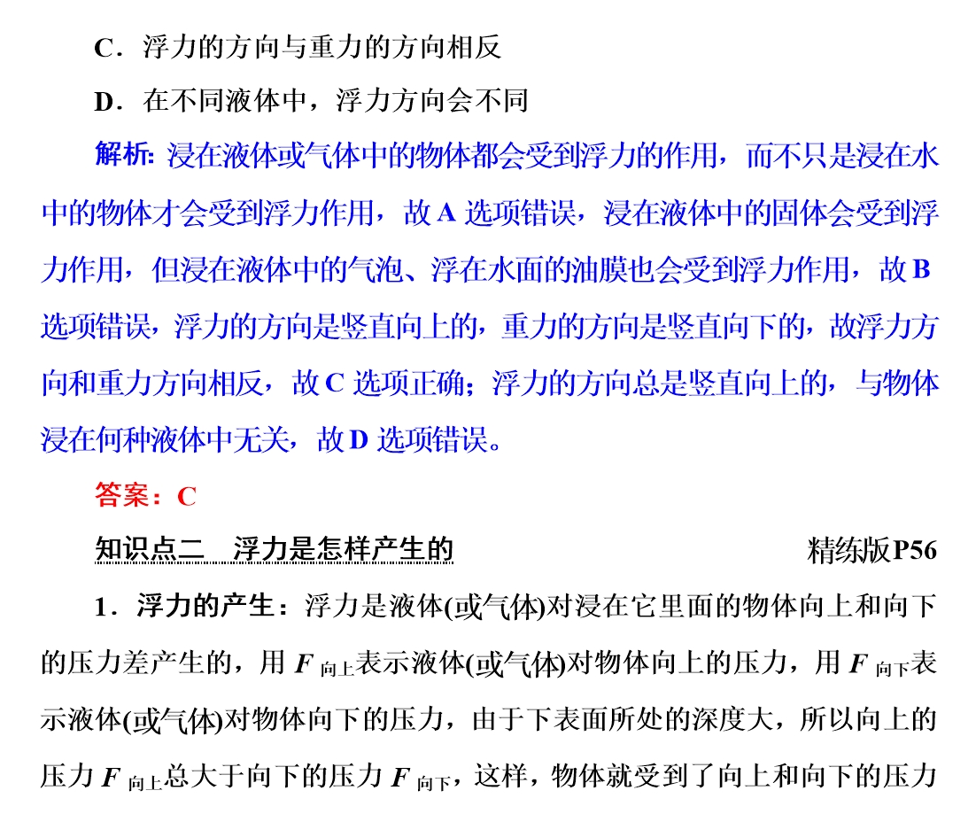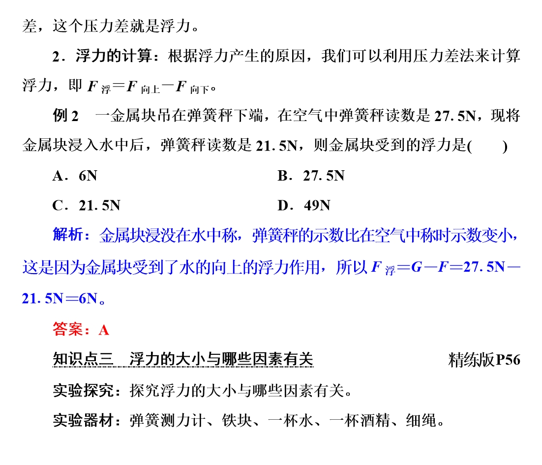 【内容简介】类型一 浮力概念辨析命题点:(1)浮力概念;(2)浮力的三要素。例1 如图所示,A漂浮在水面上,B悬浮在水中静止,C沉入水底,D是容器自身凸起的一部分,关于它们所受浮力的情况说法错误的是( ) A.A物体一定受浮力 B.B物体一定受浮力C.C物体一定受浮力 D.D物体一定受浮力解析:由图可知,水对A物体上表面没有受到水的压力,但下表面受到水的压力,因此水对A物体上下表面产生了的压力差,A物体受浮力的作用,故选项A正确;B物体上下表面产生了的压力差,B物体一定受浮力的作用,故选项B正确;由图可知,水对C物体上下表面产生了的压力差,C物体受浮力的作用,故选项C正确;D物体上表面受到水的压力,但下表面没有受到水的压力,因此水对D物体只有向下的压力,没有向上的压力,D物体不受浮力的作用,故选项D错误。答案:D类型二 探究影响浮力大小的因素命题点:(1)实验原理;(2)实验步骤;(3)实验结论等。例2 探究“影响浮力大小的因素”时,小红做了如图所示的实验。请你根据她的实验探究,回答下列问题: (1)比较图B和C可知,物体受到的浮力大小与排开液体的________有关。(2)比较图C和E可知,物体受到的浮力大小与液体的________有关。(3)比较图C和________可知,浮力的大小与物体浸没在液体中的深度无关。(4)图E中物体受到浮力大小为________N。(5)比较图C和E可知,水对杯底的压强_________(选填“大于”“小于”或“等于”)酒精对杯底的压强。解析:(1)比较图B和C可知,物体浸入液体中的体积不同,即物体排开液体的体积不同,弹簧测力计的示数不同,表示浮力不同,由此可知,物体受到的浮力大小与排开液体的体积有关。(2)比较图C和E可知,物体排开液体的体积相同,液体的密度不同,浮力大小不同,由此可知,物体受到的浮力大小与液体的密度有关。(3)要探究浮力的大小与物体浸没在液体中的深度的关系,必须控制物体排开液体的体积及液体的密度相同,使物体浸没在液体中的深度不同,由题图可知,图C和D符合要求。(4)图E中物体受到的浮力大小F浮=G-F拉=4.0N-3.2N=0.8N。(5)比较图C和E可知,液体深度相同,ρ水>ρ酒精,由公式p=ρgh可知,p水>p酒精,即水对杯底的压强大于酒精对杯底的压强。答案:(1)体积 (2)密度 (3)D (4)0.8 (5)大于点拨:本题利用了控制变量法解题:就是在研究和解决问题的过程中,对影响事物变化规律的因素和条件加以人为控制,只改变某个变量的大小,而保证其他的变量不变,最终解决所研究的问题。类型三 阿基米德原理及应用命题点:(1)阿基米德原理公式、单位;(2)阿基米德原理变形公式。........