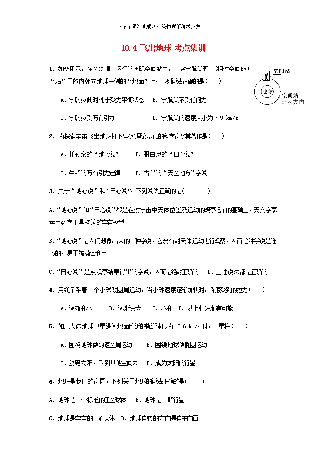 【内容简介】1.如图所示,在圆轨道上运行的国际空间站里,一名宇航员静止(相对空间舱)“站”于舱内朝向地球一侧的“地面”上,下列说法正确的是( )A.宇航员此时处于受力平衡状态 B.宇航员不受任何力C.宇航员受万有引力 D.宇航员的速度大小为7.9 km/s2.为探索宇宙飞出地球打下坚实理论基础的科学家及其著作是( )A.托勒密的“地心说” B.哥白尼的“日心说”C.牛顿的万有引力定律 D.古代的“天圆地方”学说3.关于“地心说”和“日心说”,下列说法正确的是( )A.“地心说”和“日心说”都是在对宇宙中天体位置及运动的观察记录的基础上,天文学家运用数学工具构筑的宇宙模型B.“地心说”是人们想象出来的一种学说,它没有对天体运动进行观察,因而这种学说是唯心的,易于被教会利用C.“日心说”是从观察结果得出的学说,因而是绝对正确的 D.上述说法都是正确的4.用绳子系着一个小球做圆周运动,当小球速度逐渐加快时,你感受到的拉力( )A.逐渐变小 B.逐渐变大 C.不变 D.以上情况都有可能5.如果人造地球卫星进入地面附近的轨道速度为13.6 km/s时,卫星将( )A.围绕地球做匀速圆周运动 B.围绕地球做椭圆运动 C.脱离太阳,飞到其他空间去 D.成为太阳的行星......