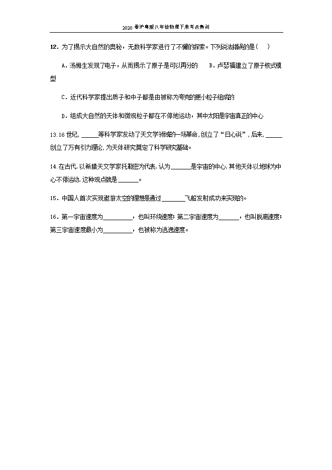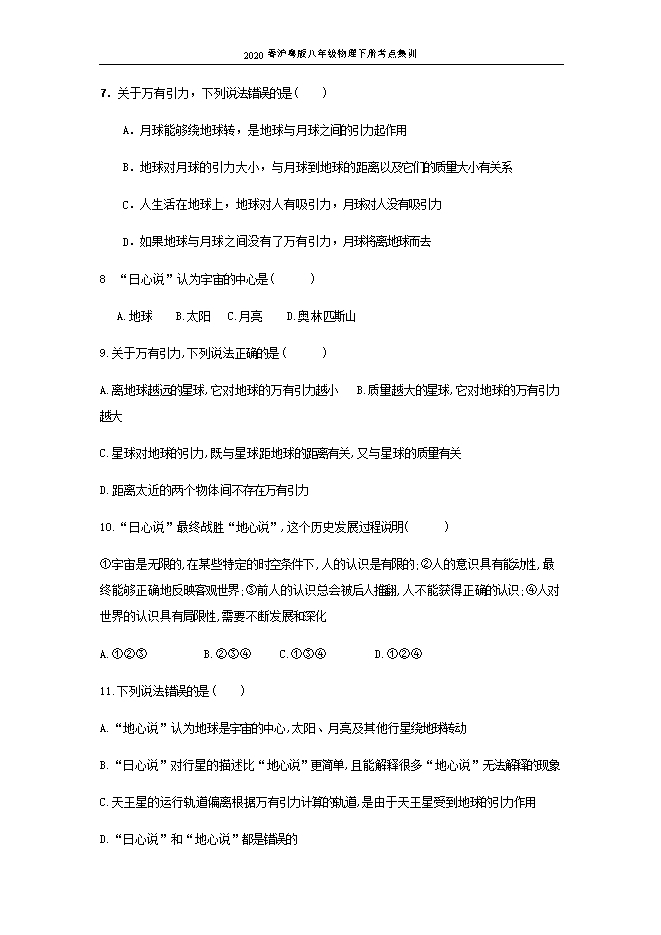 - 4402020春沪粤版八年级物理下册考点集训:10.5 宇宙深处(附答案)