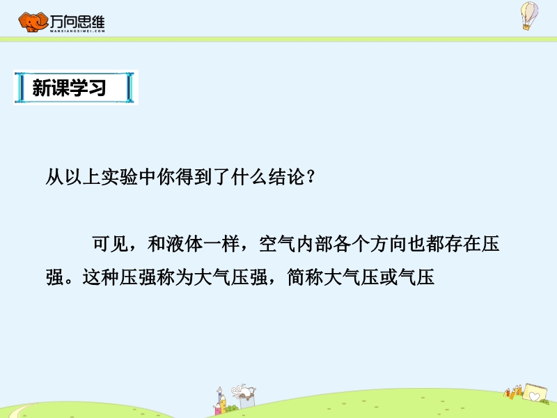 【内容简介】一、怎样知道大气有压强和液体一样,空气内部各个方向也都存在压强。这种压强称为大气压强,简称大气压或气压马德堡半球实验进一步证明了大气压的存在,而且证明其非常大那么,大气压强到底有多大如何测量呢?二、怎样测量大气压1.估测大气压(1)把注射器的活塞推至注射器筒的底端,然后用橡皮帽堵住注射器的小孔,这样做的目的是将管内空气排出(2)用刻度尺测出注射器的全部刻度的长度为为L,从注射器上可以知道体积为V,计算得到活塞的横截面积为S=V/L根据二力平衡知识:F大气=F拉,又: F拉=G码=m码g,所以:P大气= F大气/S塞= m码g/S= m码gL/V该实验过程中导致误差的因素有?a.橡皮帽漏气、筒内没有完全排尽空气、活塞与注射器筒间不完全密封会使实验结果偏小;b.活塞与注射器筒间有摩擦会使实验结果偏大; 2、托里拆利(意大利 )实验