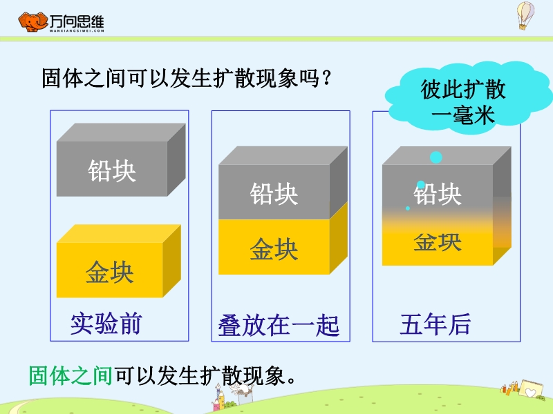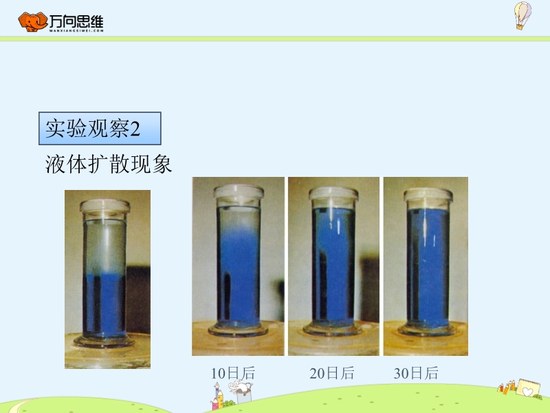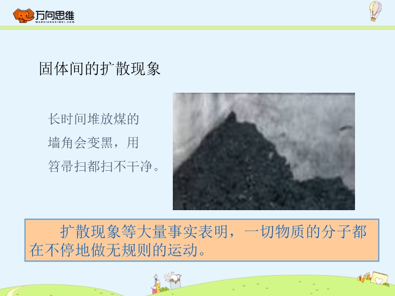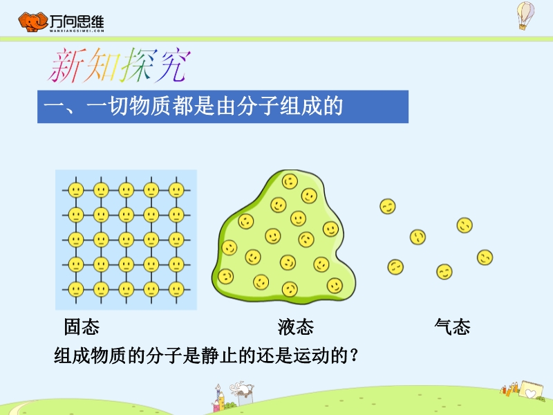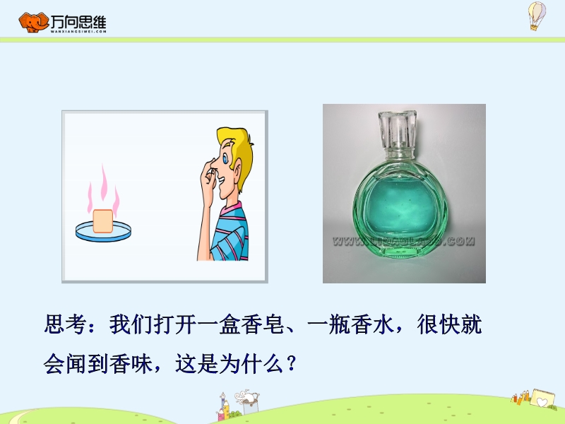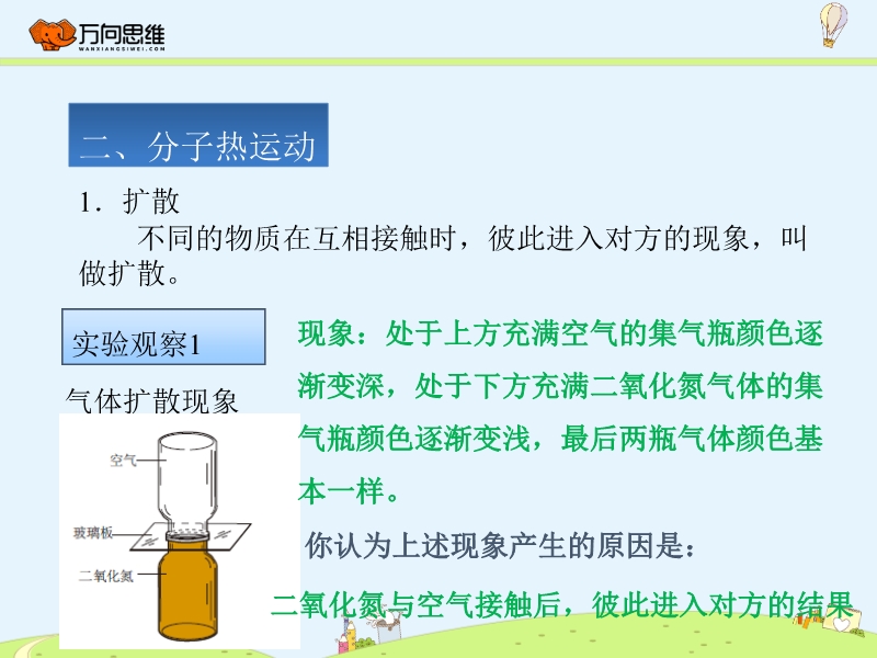 【内容简介】思考:我们打开一盒香皂、一瓶香水,很快就会闻到香味,这是为什么?一、一切物质都是由分子组成的 二、分子热运动1.扩散 不同的物质在互相接触时,彼此进入对方的现象,叫做扩散。现象:处于上方充满空气的集气瓶颜色逐渐变深,处于下方充满二氧化氮气体的集气瓶颜色逐渐变浅,最后两瓶气体颜色基本一样。由于分子的运动跟温度有关,所以这种无规则运动叫分子的热运动。温度越高,热运动越剧烈。实验表明,分子间同时存在引力和斥力。 分子间距决定了分子间的作用力,从而决定了固体、液体和气体的特征。 气体分子之间的距离就很远,彼此之间几乎没有相互作用力。分子的世界我们无法观察,但是却能通过实验,得到分子在运动和分子间存在作用力的事实,通过直接感知的现象,推测无法直接感知的事实,这是物理学中常用的方法。