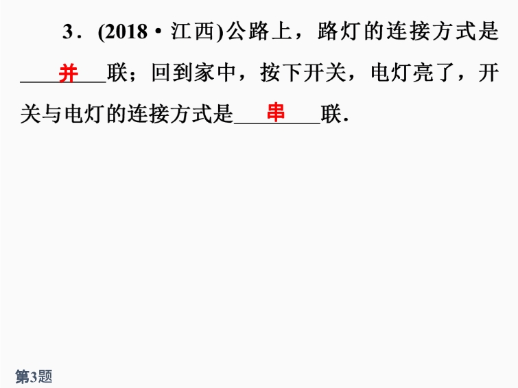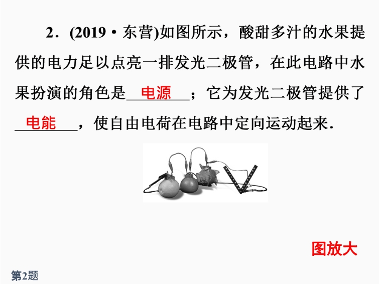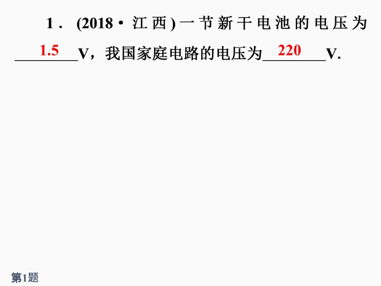 【内容简介】1.(2018•江西)一节新干电池的电压为________V,我国家庭电路的电压为________V.2.(2019•东营)如图所示,酸甜多汁的水果提供的电力足以点亮一排发光二极管,在此电路中水果扮演的角色是________;它为发光二极管提供了________,使自由电荷在电路中定向运动起来.3.(2018•江西)公路上,路灯的连接方式是________联;回到家中,按下开关,电灯亮了,开关与电灯的连接方式是________联.4.(2019•玉林)自然界只有两种电荷,人们把用丝绸摩擦过的玻璃棒带的电荷叫做________电荷:验电器是根据同种电荷互相________的原理制成的.5.(2019•铜仁)滑动变阻器是通过改变接入电路中电阻丝的________来改变电阻的大小,从而改变流过电路中的________.6.(2018•长沙模拟)在如图甲所示的电路中,闭合开关S后,两个灯泡都能发光,电流表A1和A2的指针均在图乙所示的位置,则通过灯泡L1的电流是________A,通过灯泡L2的电流是______A........