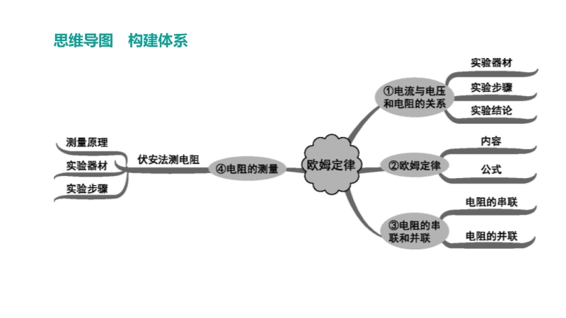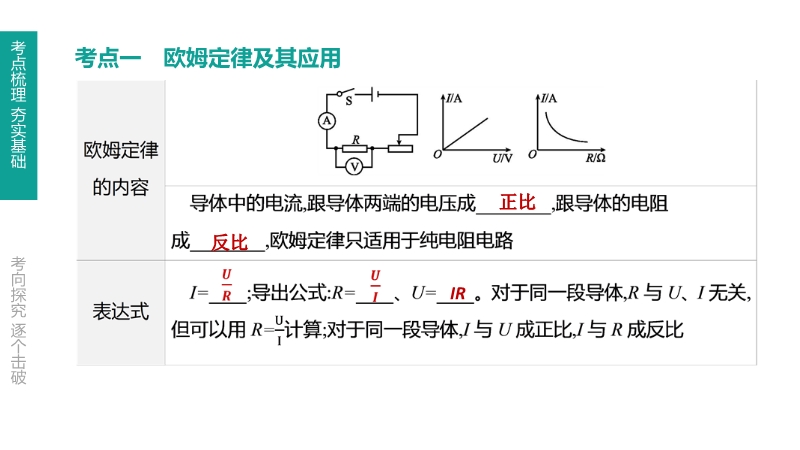 【内容简介】考点一 欧姆定律及其应用导体中的电流,跟导体两端的电压成 ,跟导体的电阻成 ,欧姆定律只适用于纯电阻电路几个导体串联相当于增加了导体的 ,所以串联后的总电阻比任何一个串联导体的电阻都要大 n个阻值为R0的电阻串联,总电阻为 几个导体并联相当于增加了导体的 ,所以并联后的总电阻比任何一个并联导体的电阻都要小 n个阻值为R0的电阻并联,总电阻为 考点二 动态电路分析由滑动变阻器的滑片移动产生的动态电路(一般不改变电路的连接方式)分析电路,确定电路连接方式、电表测量对象;根据滑片移动方向,确定滑动变阻器连入电路的电阻变化情况,得出总电阻变化情况;电源电压不变,电流与电阻成反比,确定总电流的变化情况;根据串联分压成正比、并联分流成反比,确定电表具体变化情况由开关状态改变产生的动态电路(一般改变电路的连接方式)分析电路,确定电路连接方式、电表测量对象;开关断开或闭合后,判断电路连接怎样变化、总电阻如何变化,引起总电流如何变化;根据串联分压成正比、并联分流成反比,确定电表具体变化情况