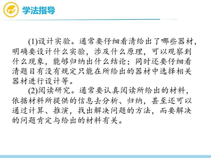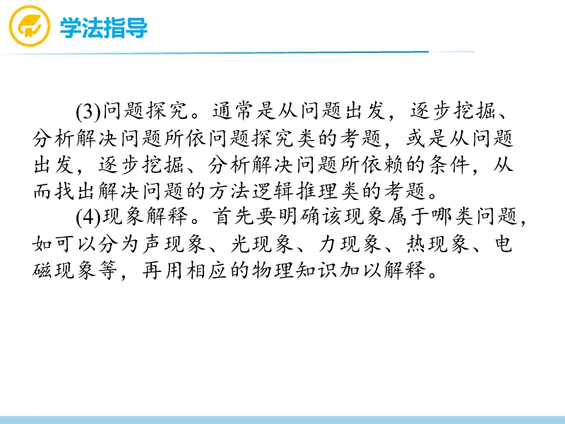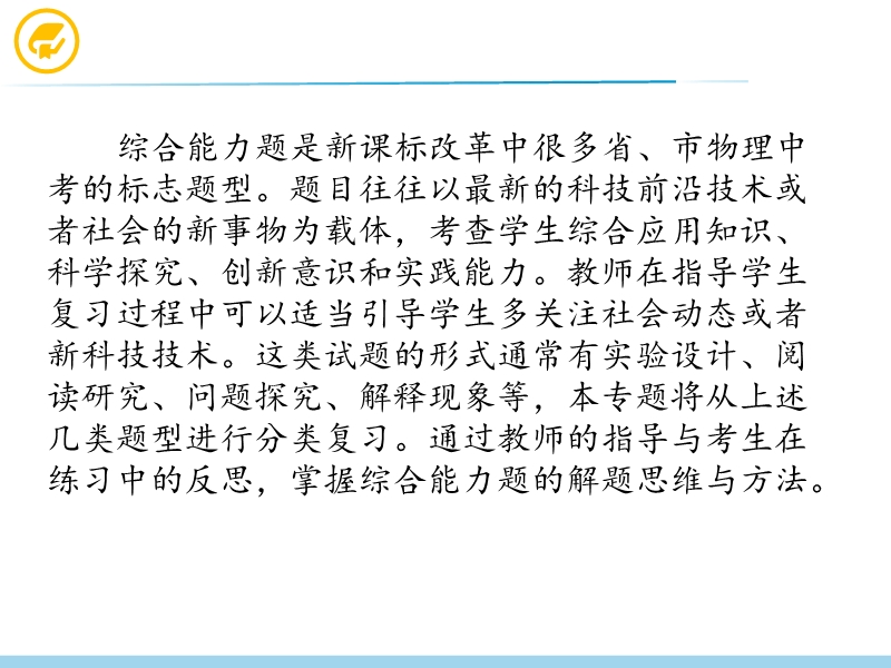 【内容简介】综合能力题是新课标改革中很多省、市物理中考的标志题型。题目往往以最新的科技前沿技术或者社会的新事物为载体,考查学生综合应用知识、科学探究、创新意识和实践能力。教师在指导学生复习过程中可以适当引导学生多关注社会动态或者新科技技术。这类试题的形式通常有实验设计、阅读研究、问题探究、解释现象等,本专题将从上述几类题型进行分类复习。通过教师的指导与考生在练习中的反思,掌握综合能力题的解题思维与方法。(1)设计实验。通常要仔细看清给出了哪些器材,明确要设计什么实验,涉及什么原理,可以观察到什么现象,能够归纳出什么结论;同时还要仔细看清题目有没有规定只能在所给出的器材中选择相关器材进行设计等。(2)阅读研究。通常要认真阅读所给出的材料,依据材料所提供的信息去分析、归纳,甚至还可以通过计算、推演,找出解决问题的方法,而要解决的问题肯定与给出的材料有关。(3)问题探究。通常是从问题出发,逐步挖掘、分析解决问题所依问题探究类的考题,或是从问题出发,逐步挖掘、分析解决问题所依赖的条件,从而找出解决问题的方法逻辑推理类的考题。(4)现象解释。首先要明确该现象属于哪类问题,如可以分为声现象、光现象、力现象、热现象、电磁现象等,再用相应的物理知识加以解释。